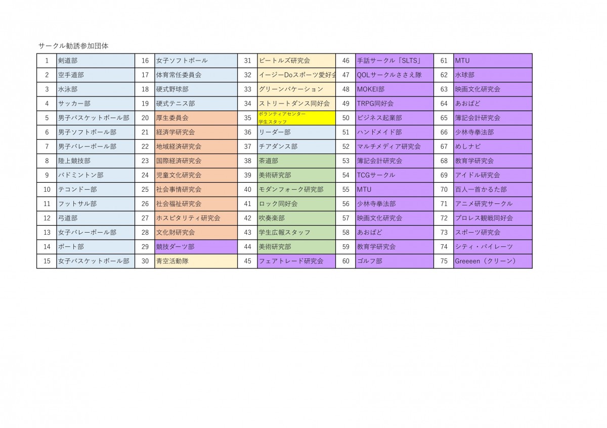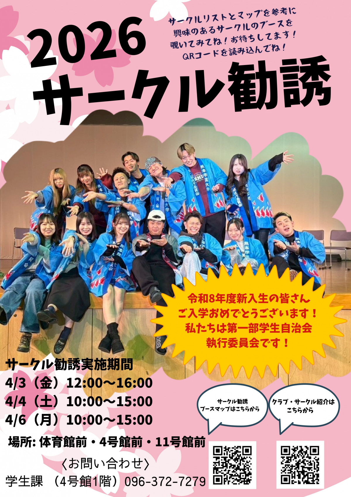 新入生向けに「令和8年度サークル勧誘」を下記の日程で開催します。興味がある新入生はサークルのブースをぜひ訪ねてみてください。詳細は下記のとおりです。