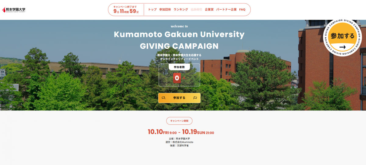 このたび本学は全国の国公立大学・私立大学約110大学とともに、部・サークル活動を行っている学生団体の応援を目的に、オンラインチャリティーイベント「Giving Campaign 2025」(文部科学省後援)を、10月10日(金)~10月19日(日)にかけて、株式会社Alumnoteと共同で開催します。