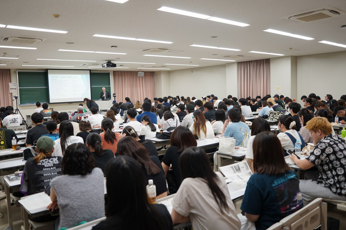 9月25日(木)、11号館1173教室において「第24期水俣学講義」の第1回講義が行われました。この講義は社会福祉学部の開講科目のひとつで、オムニバス形式で開講されます。学内教員に加えて水俣病患者、学外の研究者、ジャーナリスト、医師、法律家などを講師に迎え、水俣病を単に知識として学ぶだけではなく、歴史や法、差別などさまざまな視点から水俣病を捉え、学びを深めます。水俣学研究センターホームページから、インターネット中継をとおして一般の方にも公開されるなか、教室では約170名の学生が受講しました。