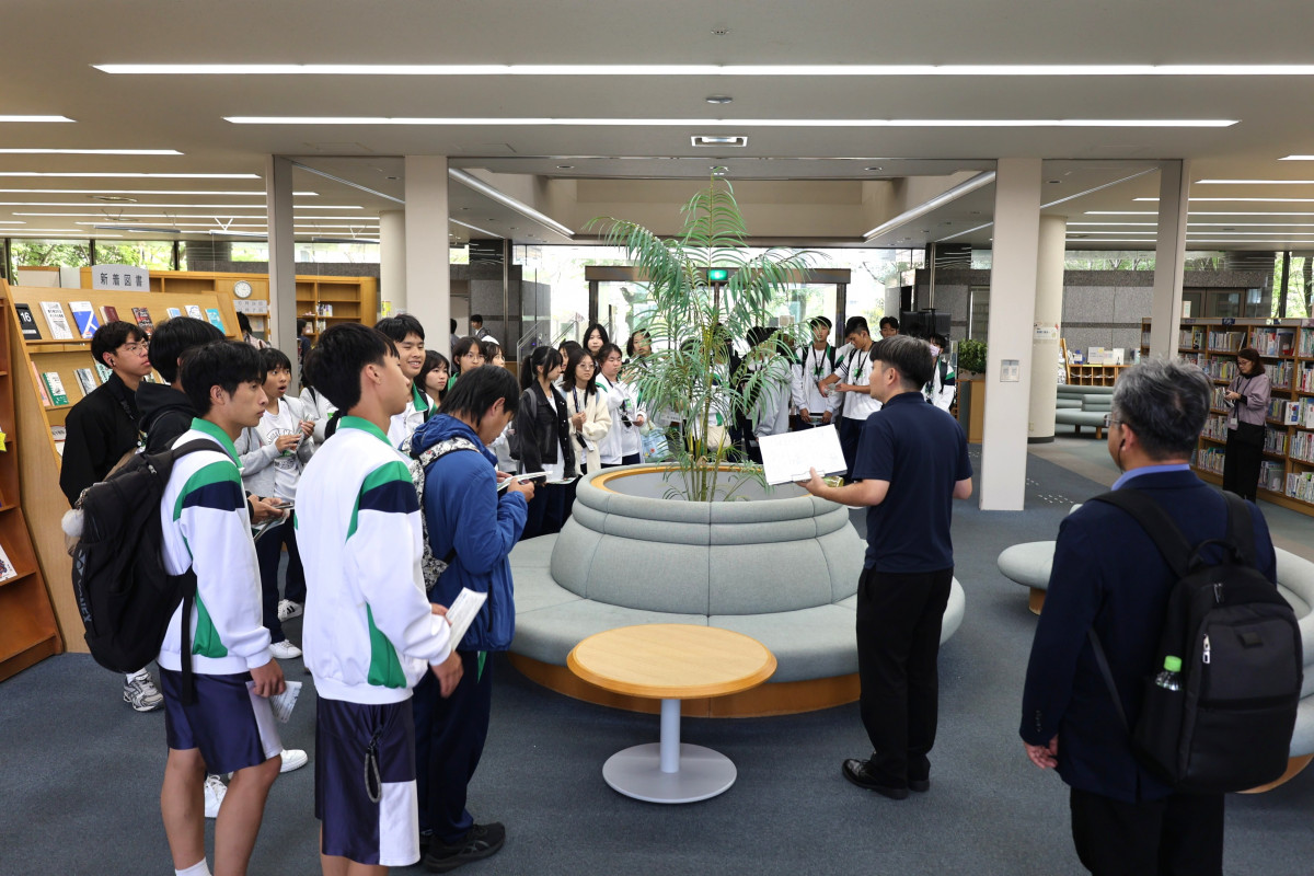 まず、キャンパスツアーで本学の各施設や図書館を見学した後、交流会会場の「新1号館 みらい」へ向かいました。