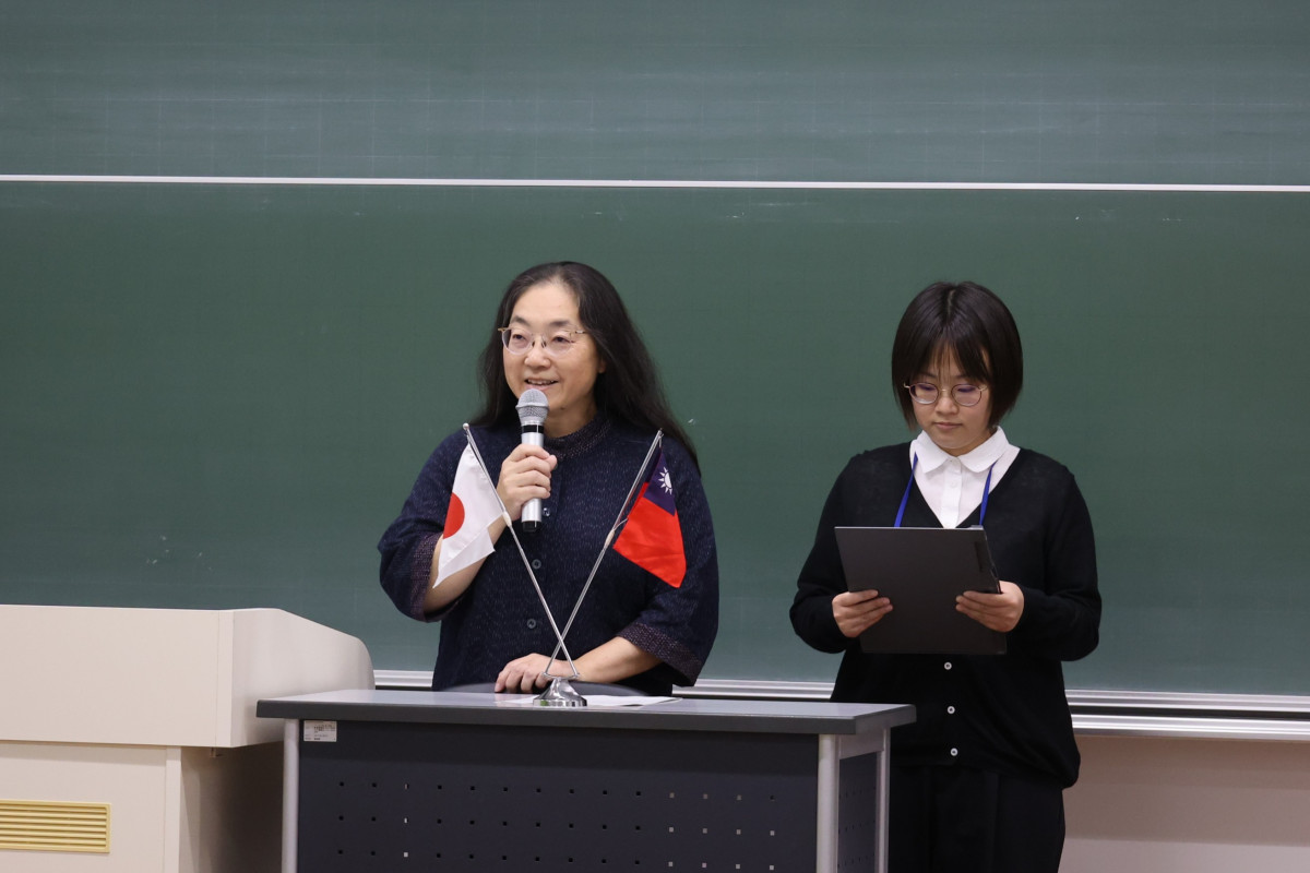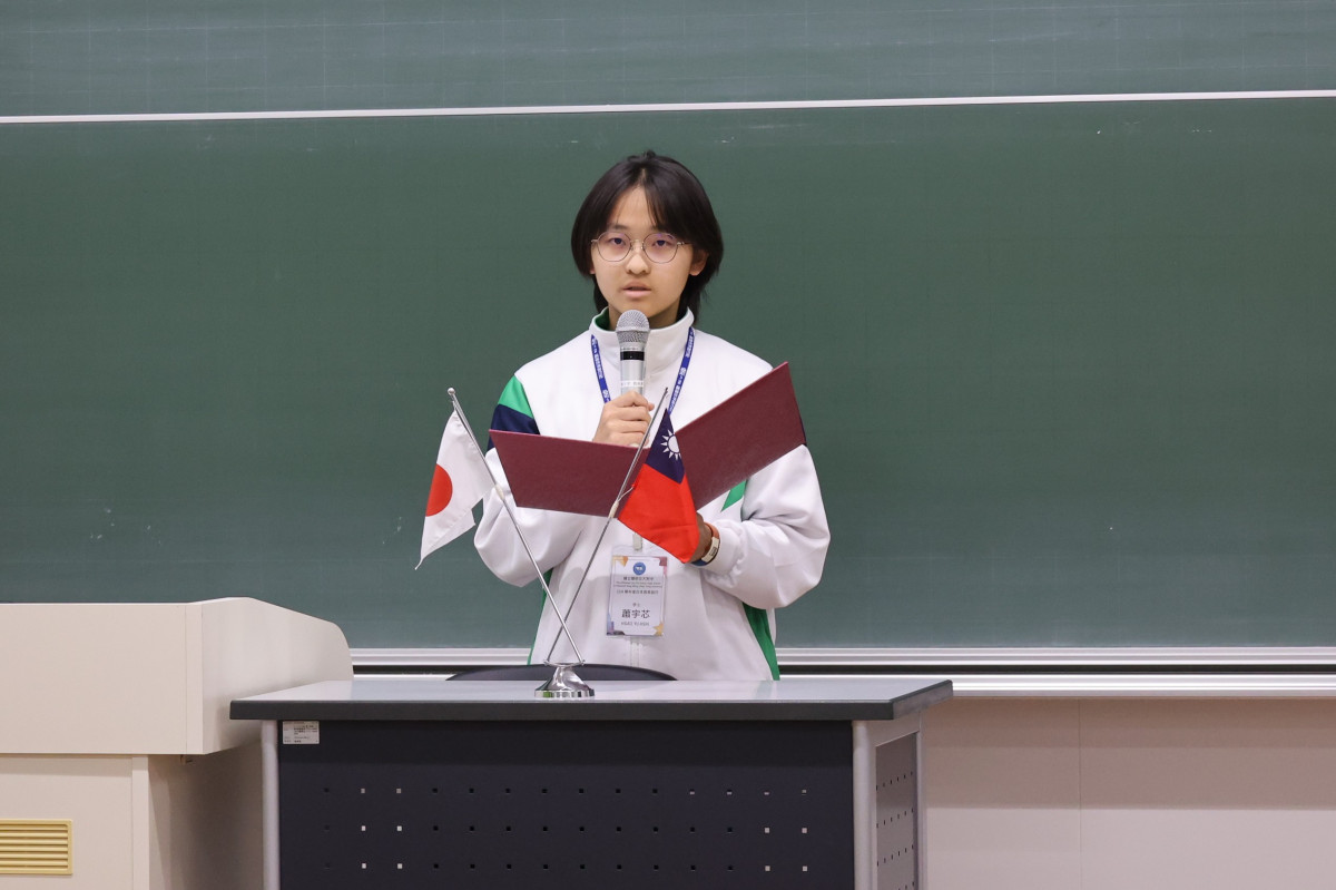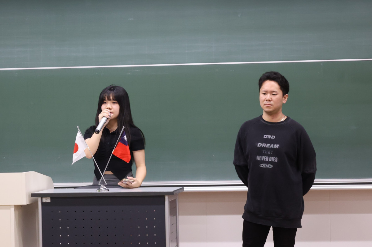 本学学生代表として嶋本智仁さん(東アジア学科3年)と、又吉紀香さん(東アジア学科2年)が中国語で「短い滞在ではありますが、有意義で楽しい時間を過ごしましょう」と歓迎の挨拶をしました。訪問団の生徒代表として蕭宇芯(ショウ ウシン)さんが、「このプログラムに参加できることをとても楽しみにしていました。今回の訪問を通じて、日本の文化をより深く体験し、多くの学びと思い出を作りたいです」と英語で挨拶しました。