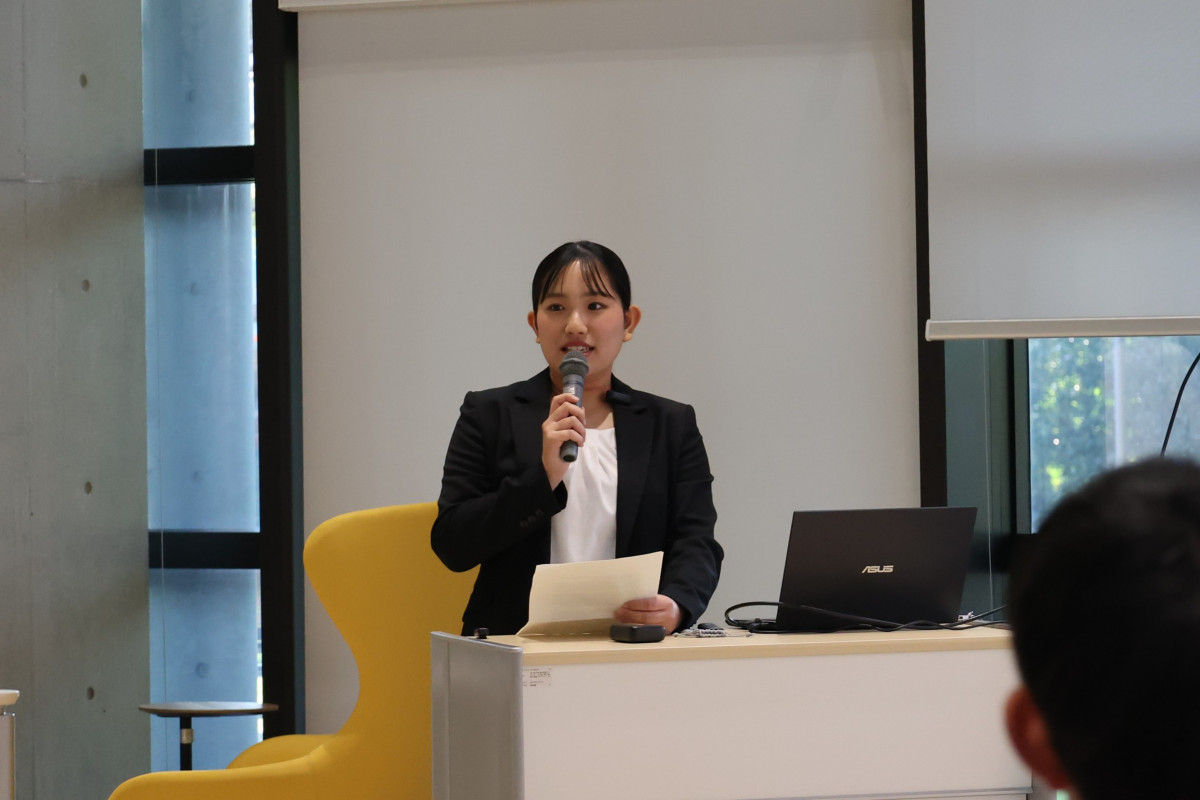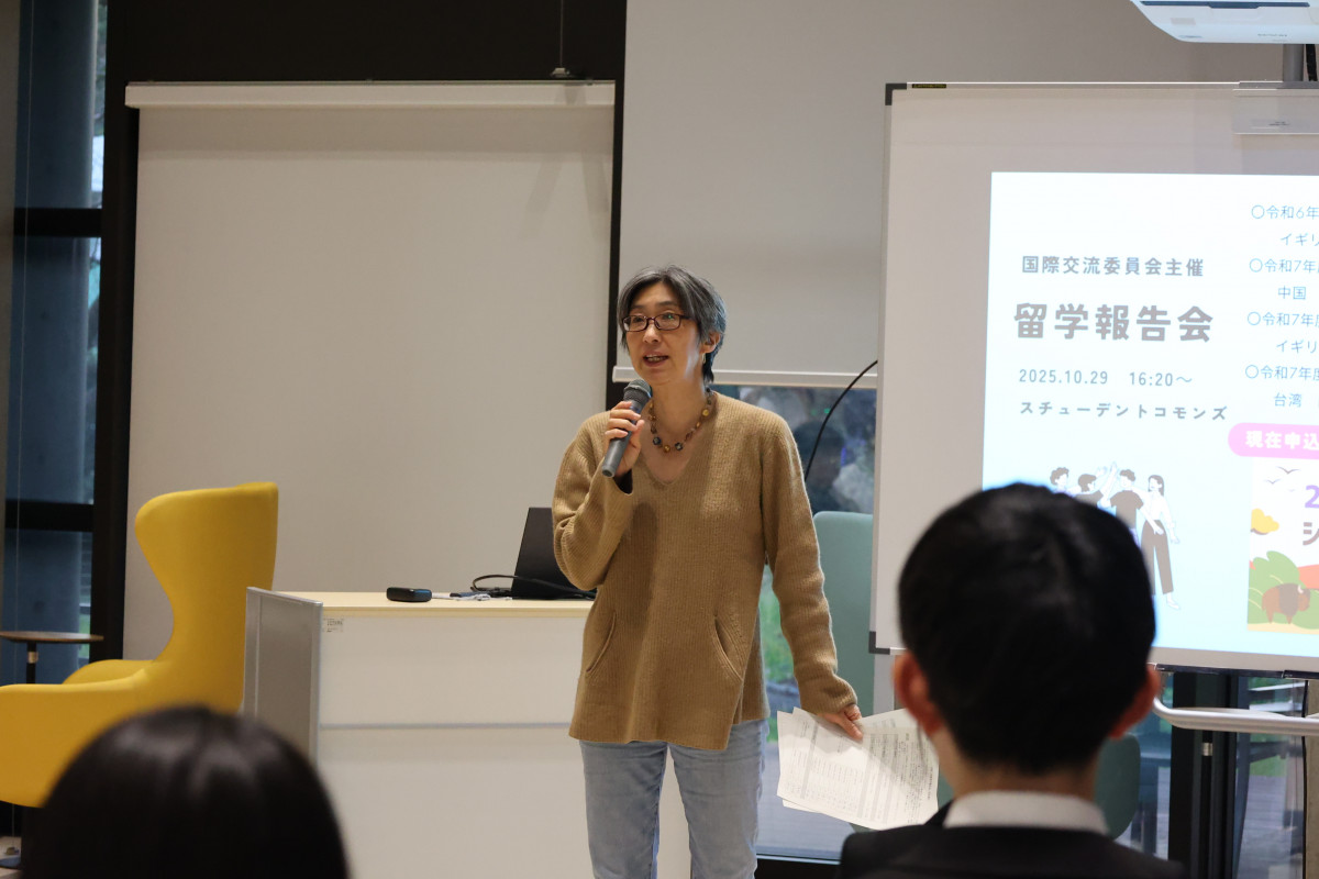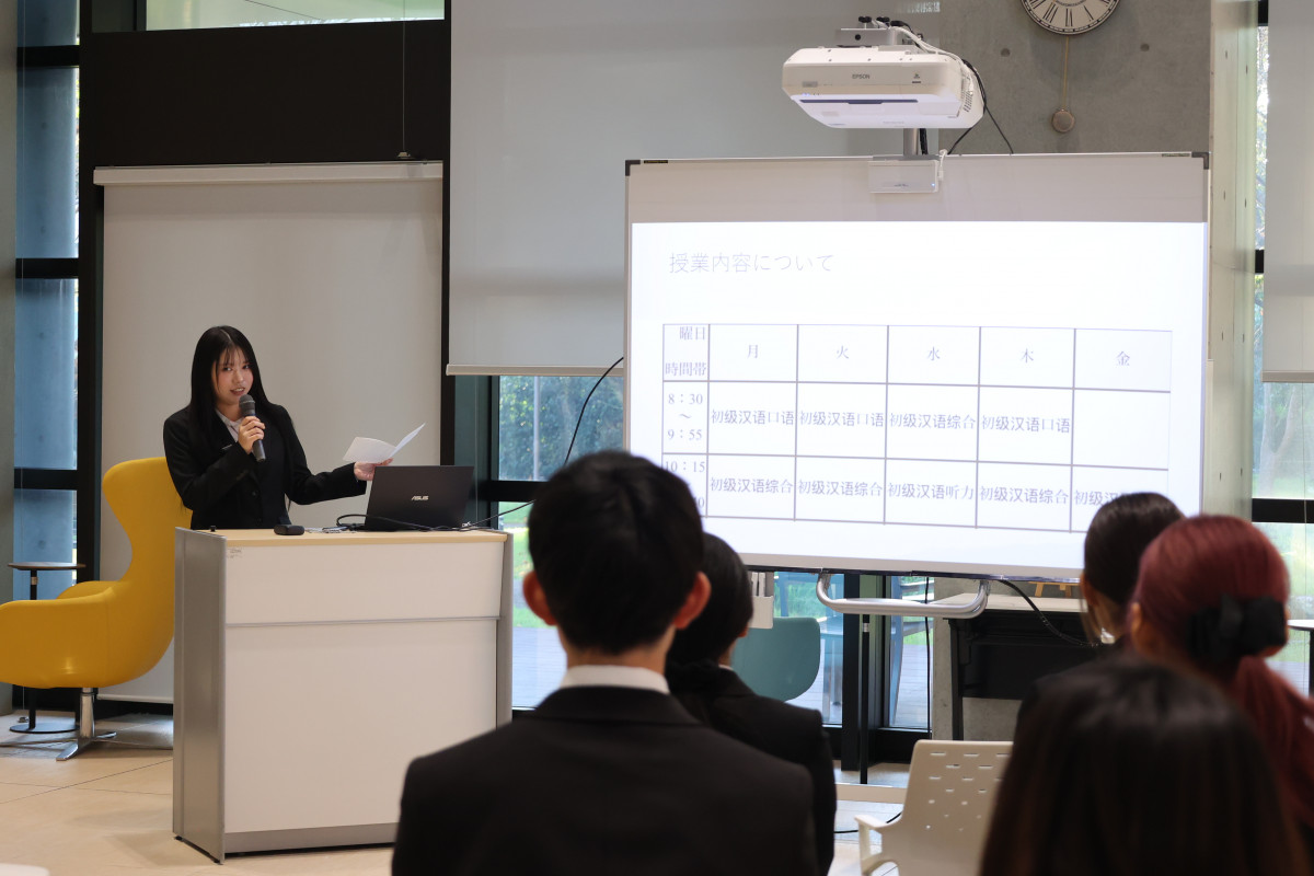 中国の深圳大学に約半年間留学した有田早由里さん(東アジア学科3年)は、授業内容や学びの成果に加えて、休日の過ごし方や宿舎での生活について紹介。「留学を通じて語学力だけでなく、自ら考え行動する力を身につけることができました。また、異なる文化のなかで、多様な考え方を受け入れることの大切さを実感しました。今後はこの経験をいかして国際的な活躍をめざしたいです」と報告しました。