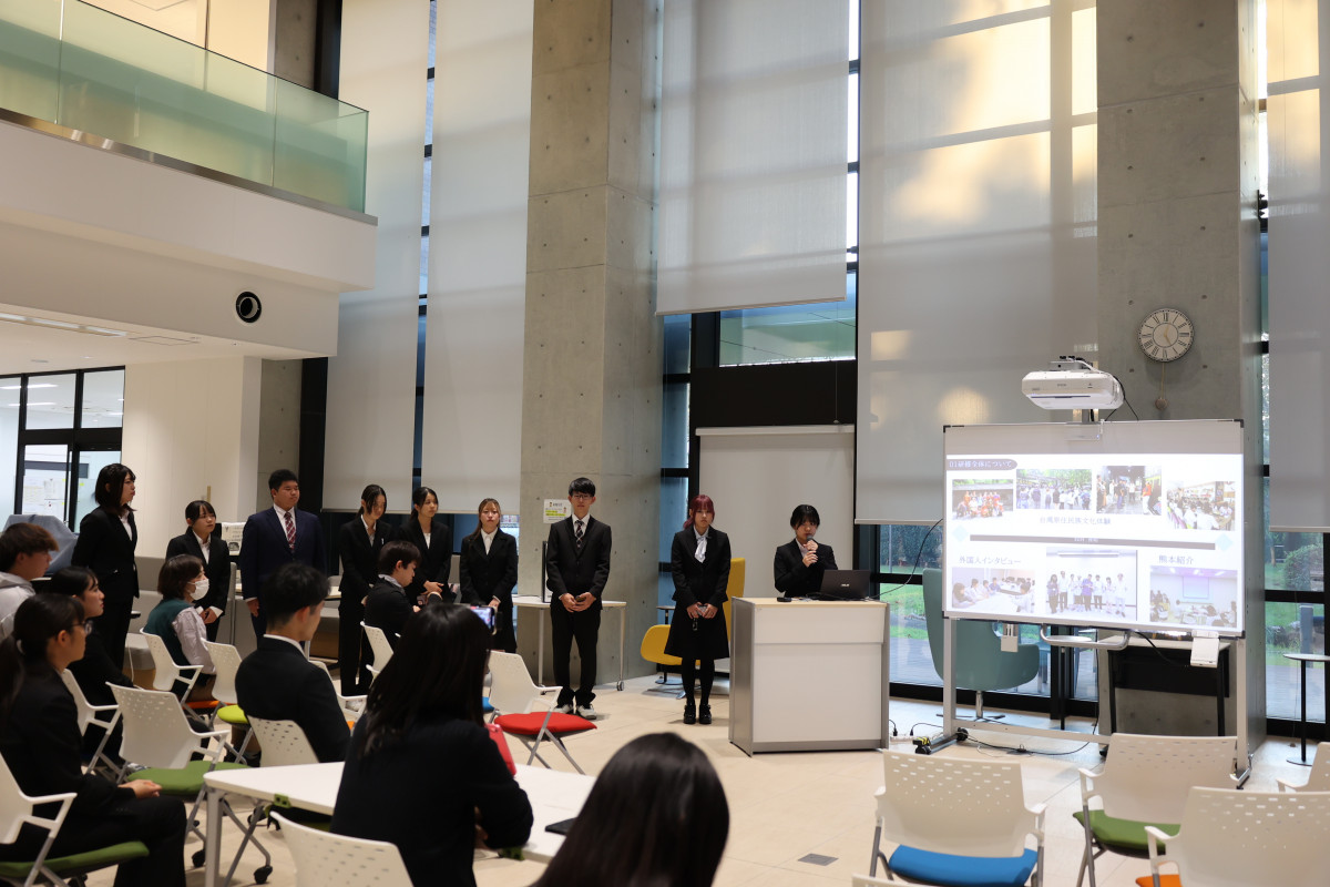 台湾の国立高雄科技大学などで8日間研修した9名は、研修内容や事前学習の成果について発表しました。研修では、台湾在住の海外の方にインタビューを行い、台湾と日本における多文化共生の違いや課題点などを国立高雄科技大学の学生と共有しました。「現地の人々との交流を通じて台湾を肌で感じる貴重な体験となりました。中国語や英語を使う場面も多く、自分の力を試すよい機会になった」と話しました。