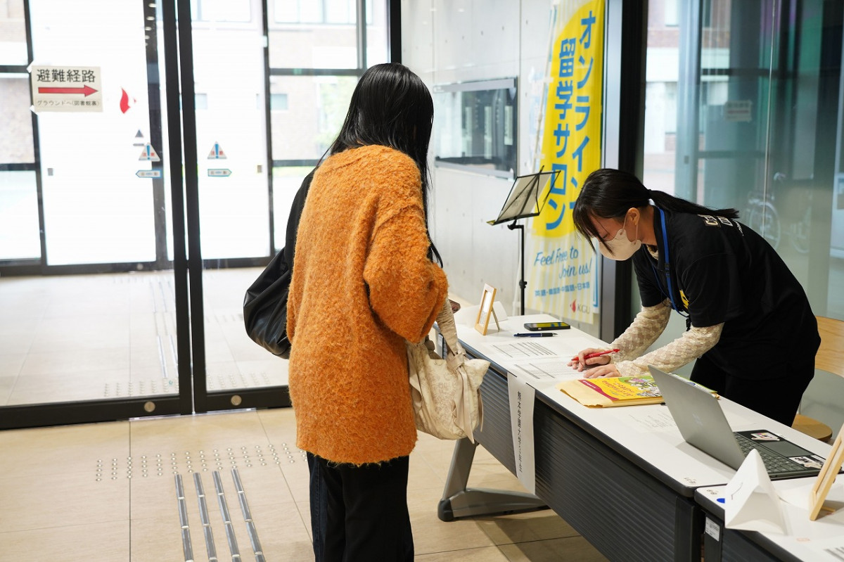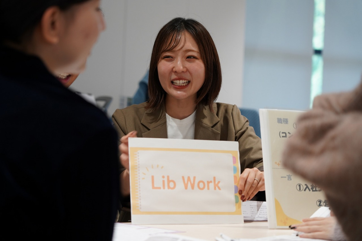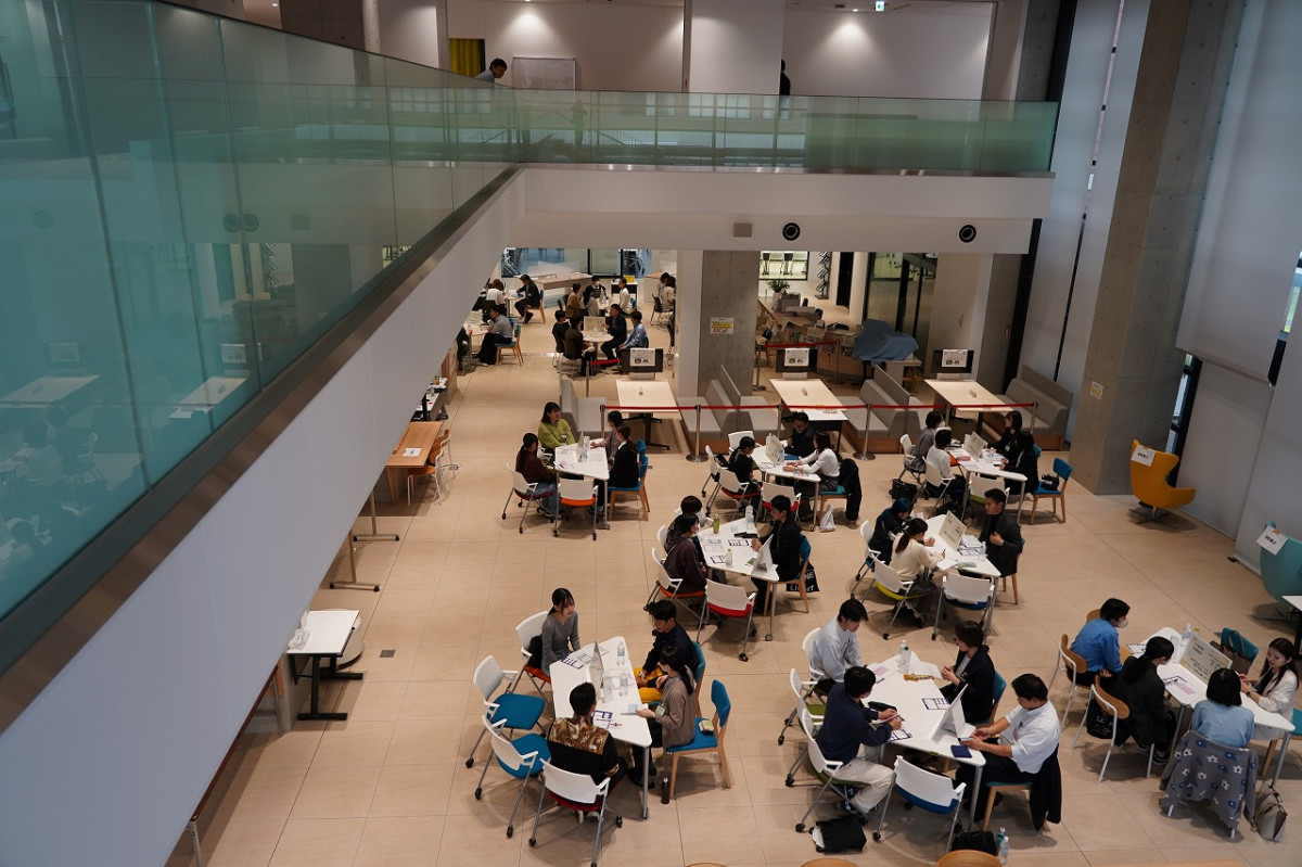 1階のスチューデントコモンズでは、企業名を伏せた状態で学生と15分間の交流を行う「まぜくるトーク」が行われました。1時間で4つブースを回る形式で、学生たちは自由にブースを訪問。企業名を伏せることで、固定概念にとらわれず、学生と企業が価値観をもとに交流することを目的としています。2階121教室では企業説明会が開催され、参加学生は関心を持つ企業の説明に熱心に耳を傾けていました。