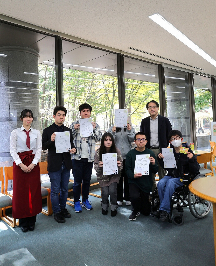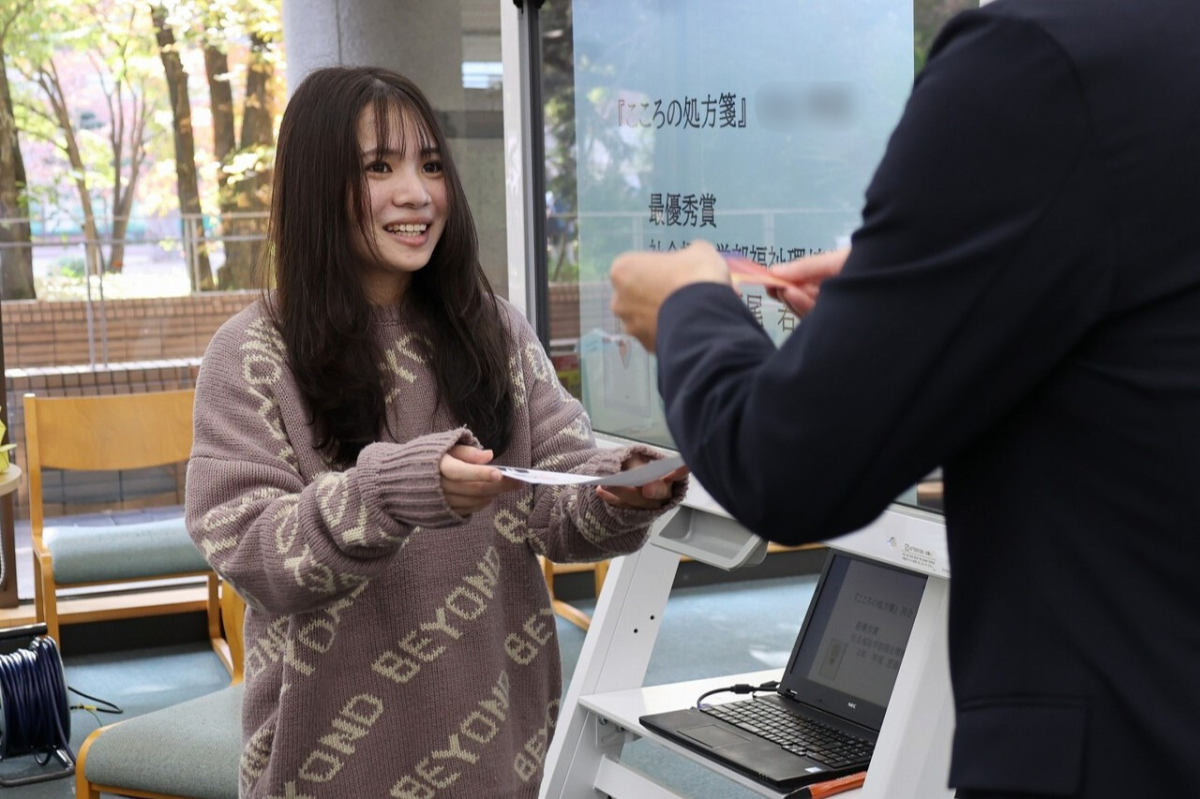 その後、厳正な審査が行われ、7名全員の受賞が決定し、11月26日(水)に図書館ラーニングコモンズで表彰式が行われました。最優秀賞には「こころの処方箋:河合隼雄著」の書評を披露した平尾若香菜さん(福祉環境学科4年)が選ばれ、圡井図書館長より賞状と賞品の図書カードが手渡されました。平尾さんは、「本が好きなので、今日中に賞品の図書カードを使ってしまうだろうと思います」と受賞の喜びを笑顔で話しました。