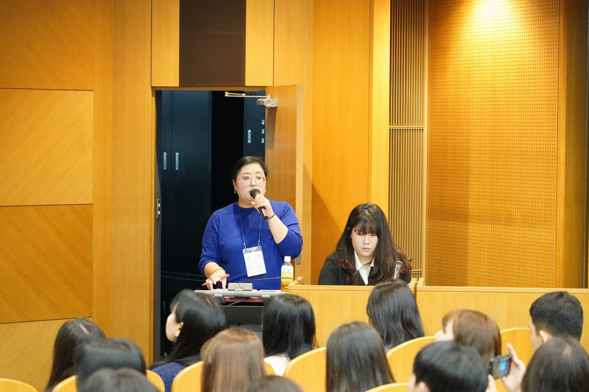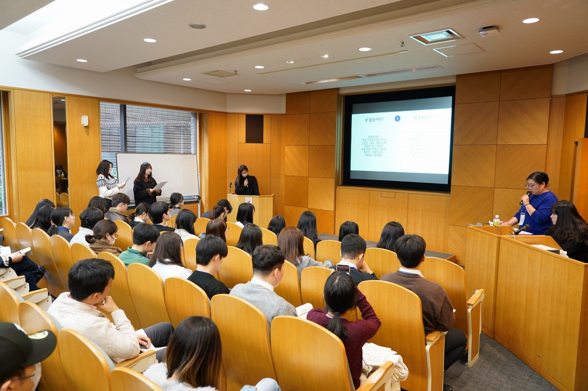 26日は、本学図書館地下AVホールにて、両大学の学生による研究発表会を日本語と韓国語で開催しました。開会にあたり、子ども家庭福祉学科長の出川聖尚子教授が「順天郷大学と本学社会福祉学部の学術交流会は今回で23回目を迎えます。本交流会が実りあるものとなることを期待します」と挨拶。