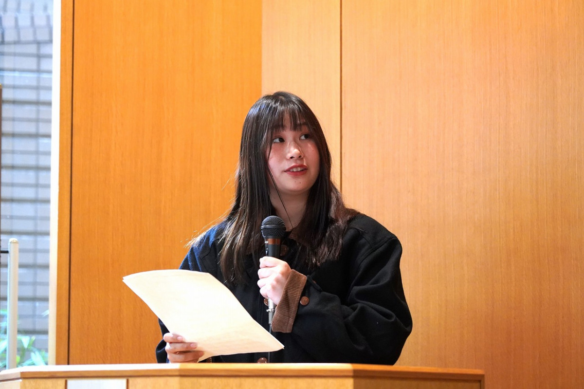 司会を務めた成瀨朱莉さん(子ども家庭福祉学科4年)は、「保育を専攻しているため、子どもの早期教育に関する発表は、日本ではあまり見ない視点で勉強になった。卒業後は障害者支援施設に就職するので、日韓の支援の違いを意識し、今回学んだことをいかしていきたい」と感想を述べました。