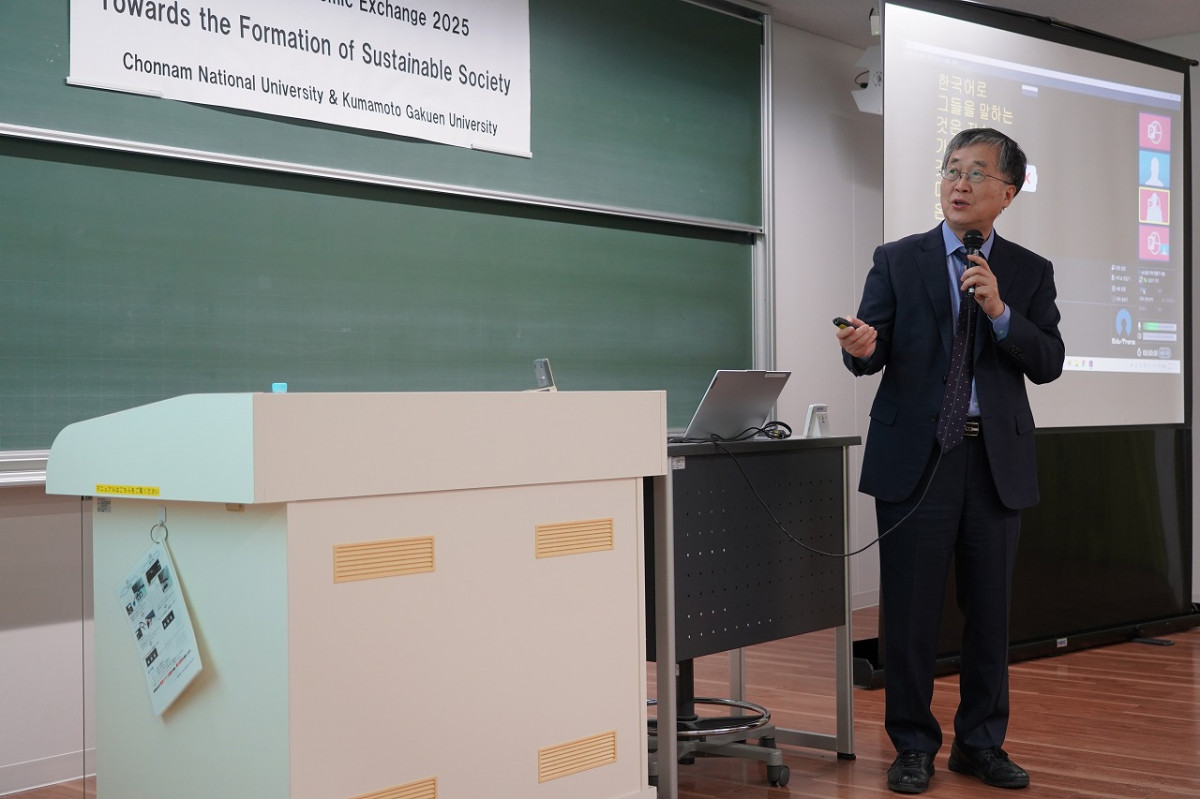 開会にあたり、林 裕学長は「本日の学術交流会が有意義な意見交換の場となり、両大学の交流および友好関係が今後も継続することを祈念しております」と英語であいさつし、歓迎の意を示しました。その後、NA Ju-Mong全南大学校経営大学長をはじめ、5名の登壇者による研究発表が行われました。