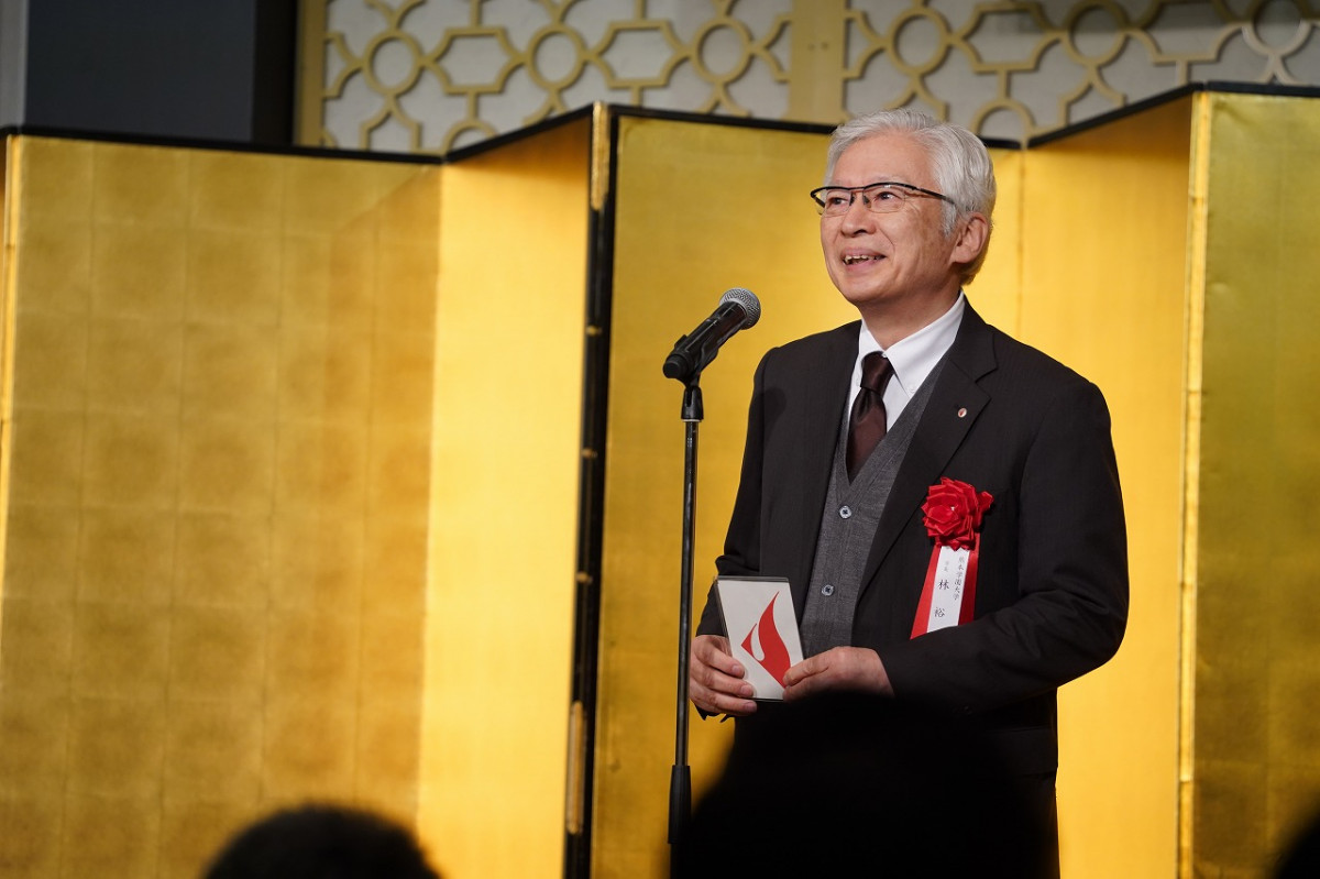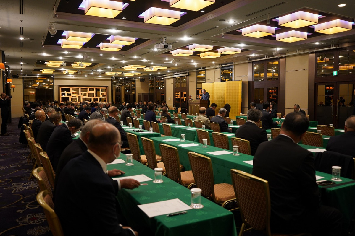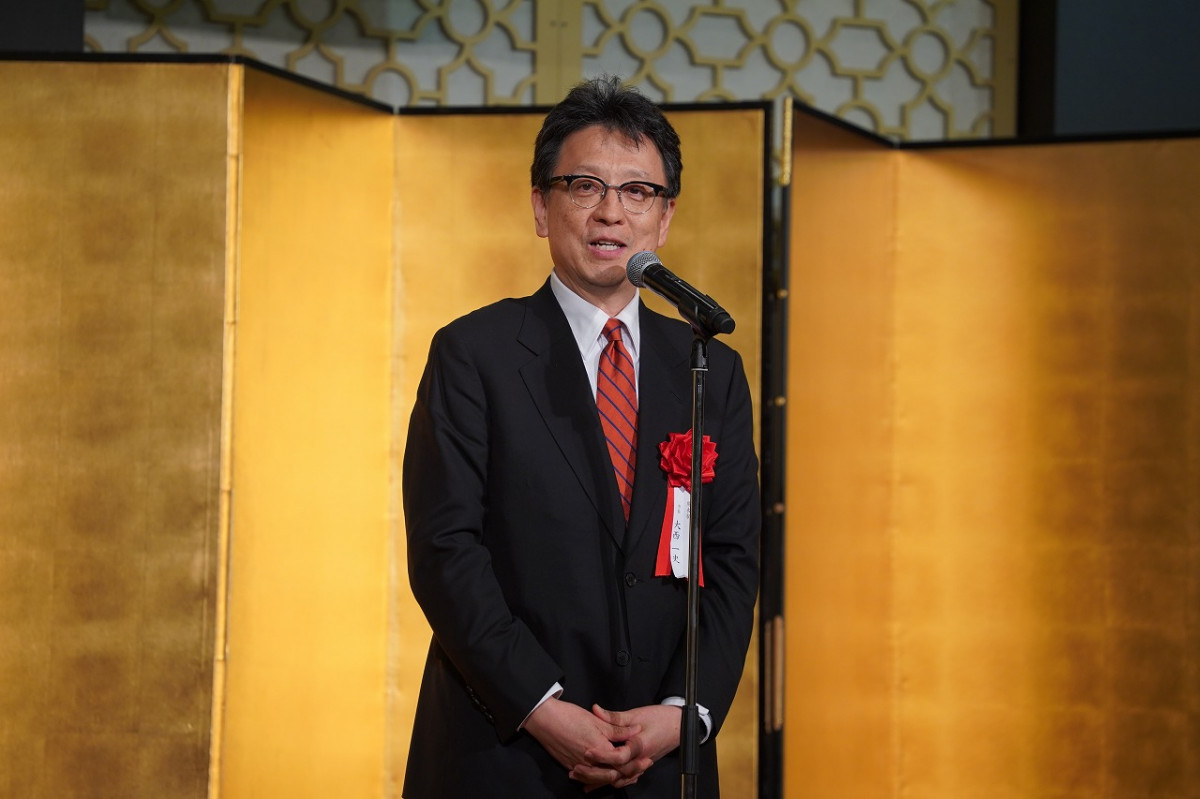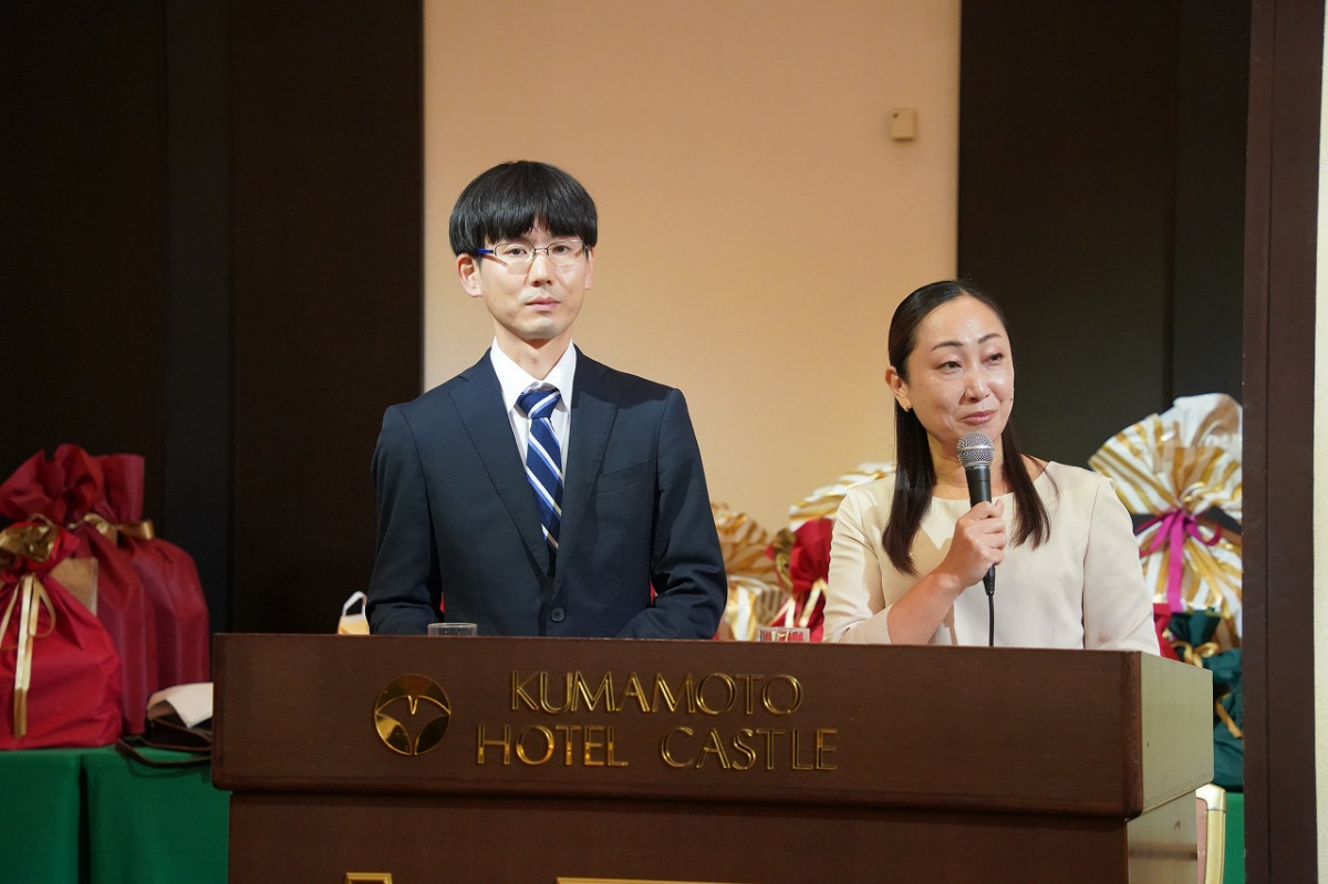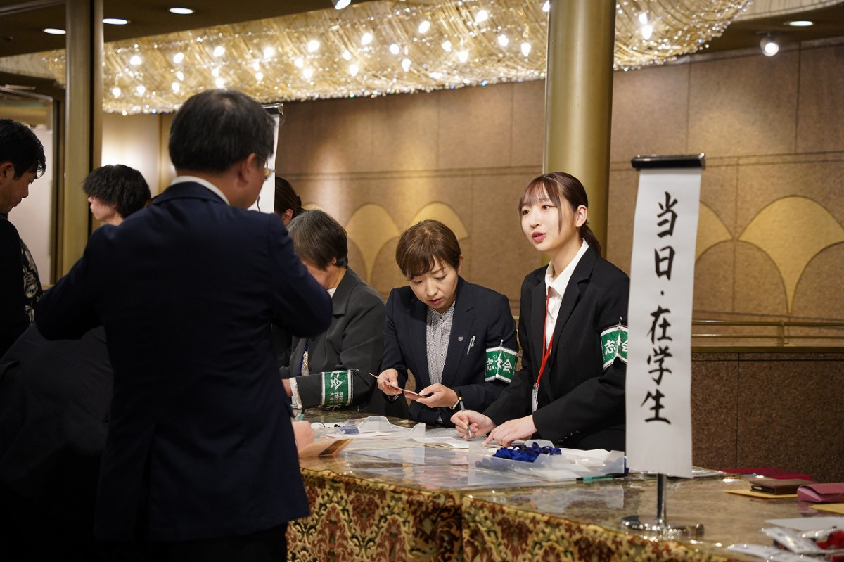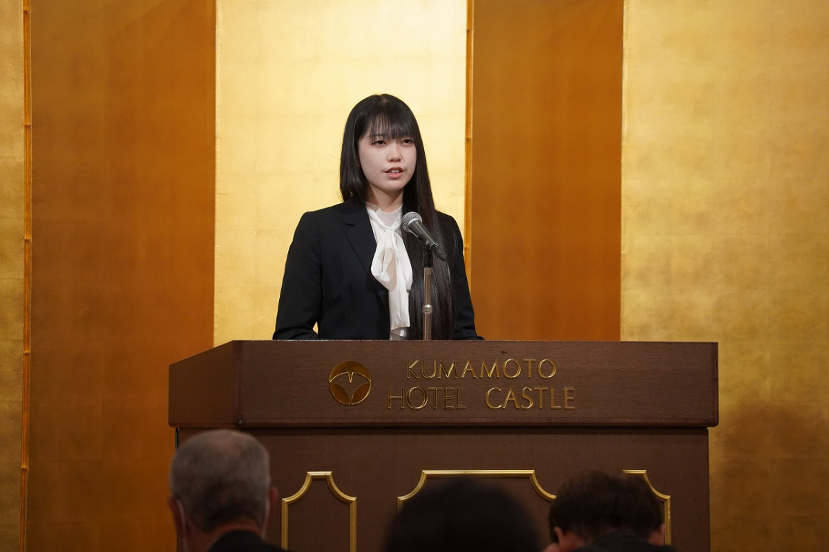 パーティーに先立って行われた志文会総会では、山鹿・和水支部を代表して石原佳幸和水町長より学生支援を目的とした寄付金が贈呈されました。続いて、志文会奨学金を活用した商学部開設70周年記念第1回ビジネスプランコンテストで最優秀賞を受賞し、今年5月に株式会社FieldinX(フィールディンクス)を設立した堀田朱乃さん(商学科4年)が登壇。これまでの取り組みを報告し、「ビジネスプランコンテストでの最優秀賞受賞は、私が挑戦の第一歩を踏み出す大きなきっかけとなりました。皆様が学生に挑戦する場や機会を与えてくださっているおかげです」と感謝の言葉を述べました。このほか、前年度の活動・決算報告や、今年度の活動計画および予算案についての審議も行われ、すべて承認されました。