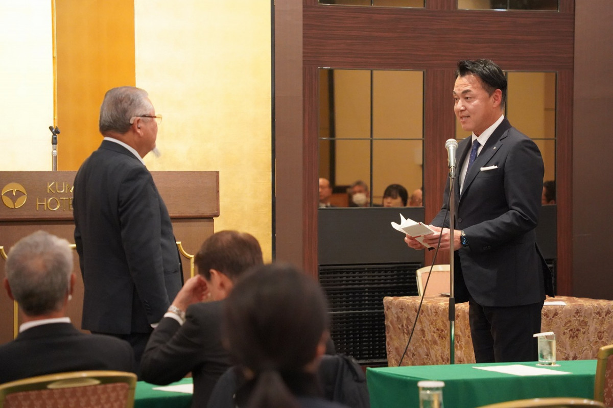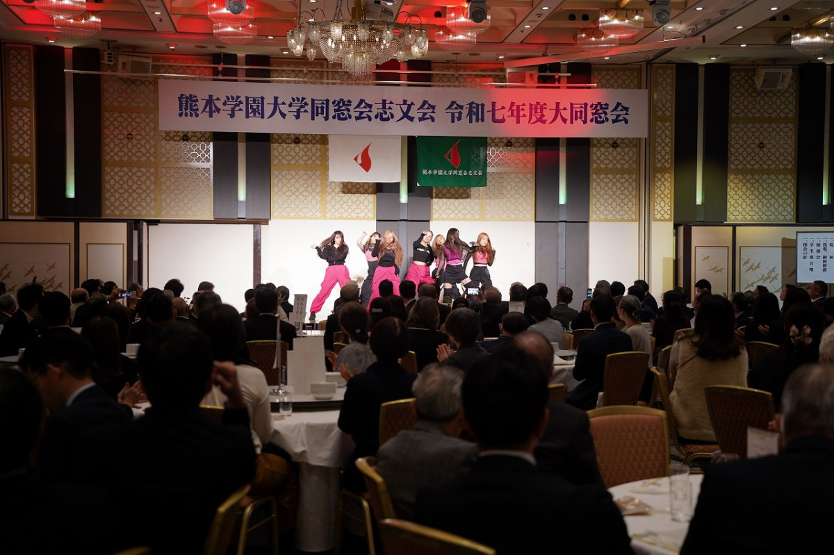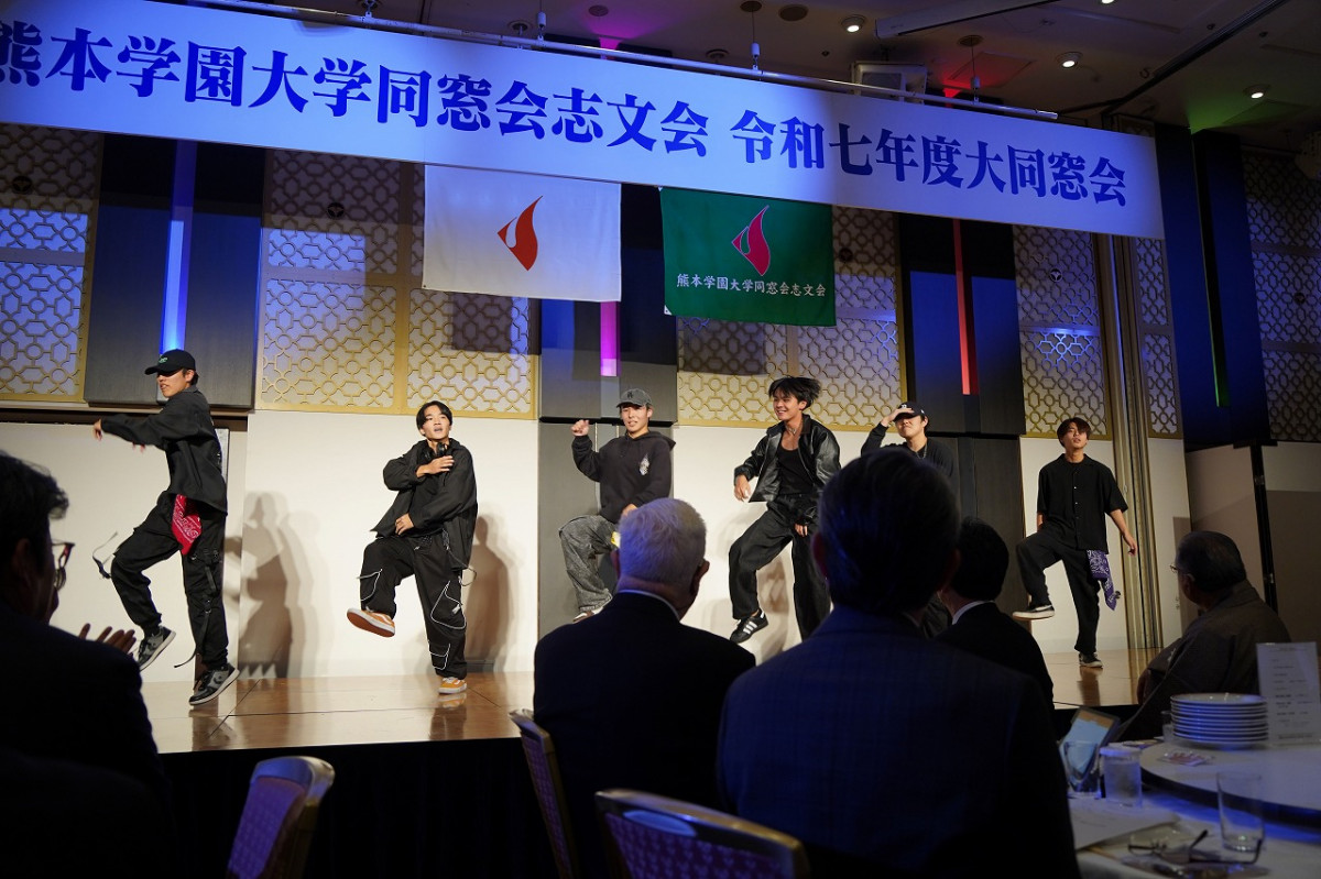 開会宣言は、パーティー実行委員長の日和田敬子さん(志文会副会長)が務め、続いて住永豊武志文会会長が挨拶を行いました。その後、ストリートダンス同好会が華やかなダンスを披露。来賓として登壇した大西一史熊本市長からは、「志文会は歴史が古く、御校の初代学長の高橋守雄先生は熊本市長(第7代)でもあり、熊本市とは強い結びつきがあります。行政や経済界など多方面にわたり多くの人材を輩出しており、熊本学園大学は熊本を支える存在です。ともに明るい熊本をつくっていきたい」と祝辞が述べられました。