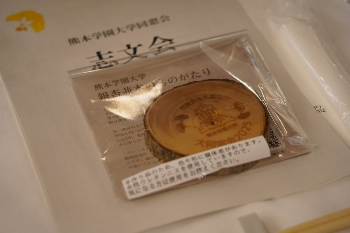 その後のパーティーでは、林原真希さん(外国語学部英米学科7期生)と、大学院国際文化研究科国際文化専攻修士課程の江越賀威さん(1年)が司会を担当。開会に先立ち、熊本学園大学管財課の伴聖悟管理係長より、参加者に配布された記念品のコースターについて説明がありました。このコースターは、今年2月に剪定した本学の象徴である銀杏並木の枝を活用して同課が制作したもので、母校を懐かしんでほしいという思いが込められています。参加者は手に取って眺めながら、当時の思い出を語り合っていました。続いて登場した熊本城おもてなし武将隊は、迫力あるパフォーマンスで会場を盛り上げ、掛け声に合わせて同窓生が一体となり鬨の声をあげました。
