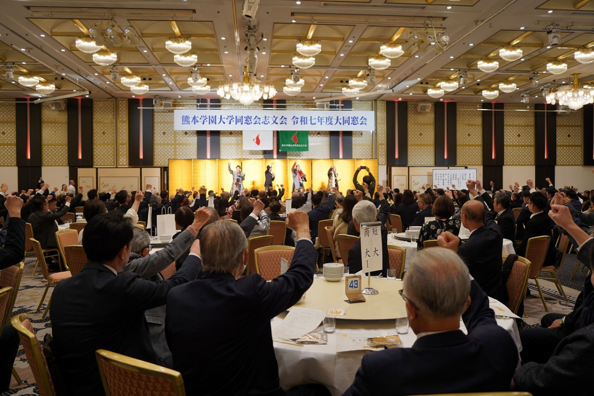 結びには応援団のリードで、全員で学生歌を斉唱。万歳三唱を行って閉会し、大同窓会は盛況のうちに幕を下ろしました。