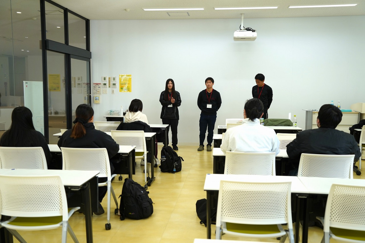 その一環として、12月9日(火)には、「新1号館 みらい」1階のアクティブラーニングルームで、警察や消防の内定を獲得した4年生による公安系志望者向けのオリエンテーションが開催され、3年生5名が参加しました。