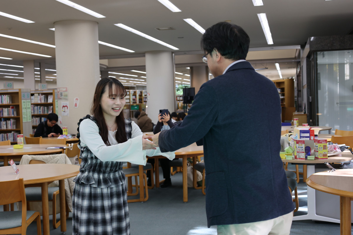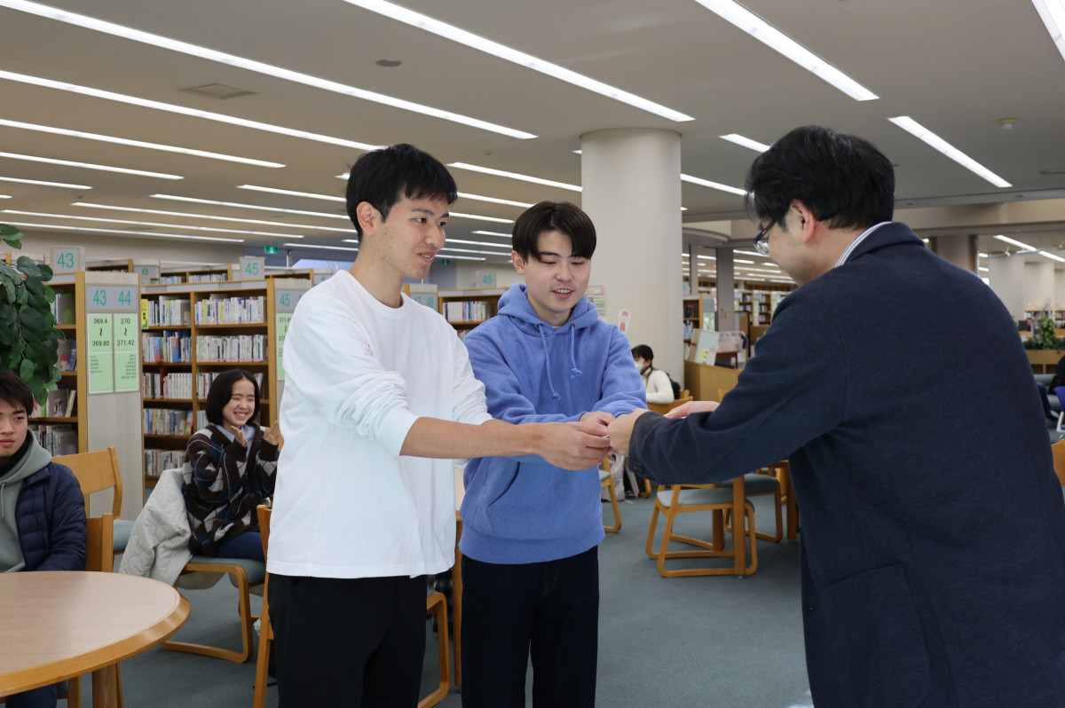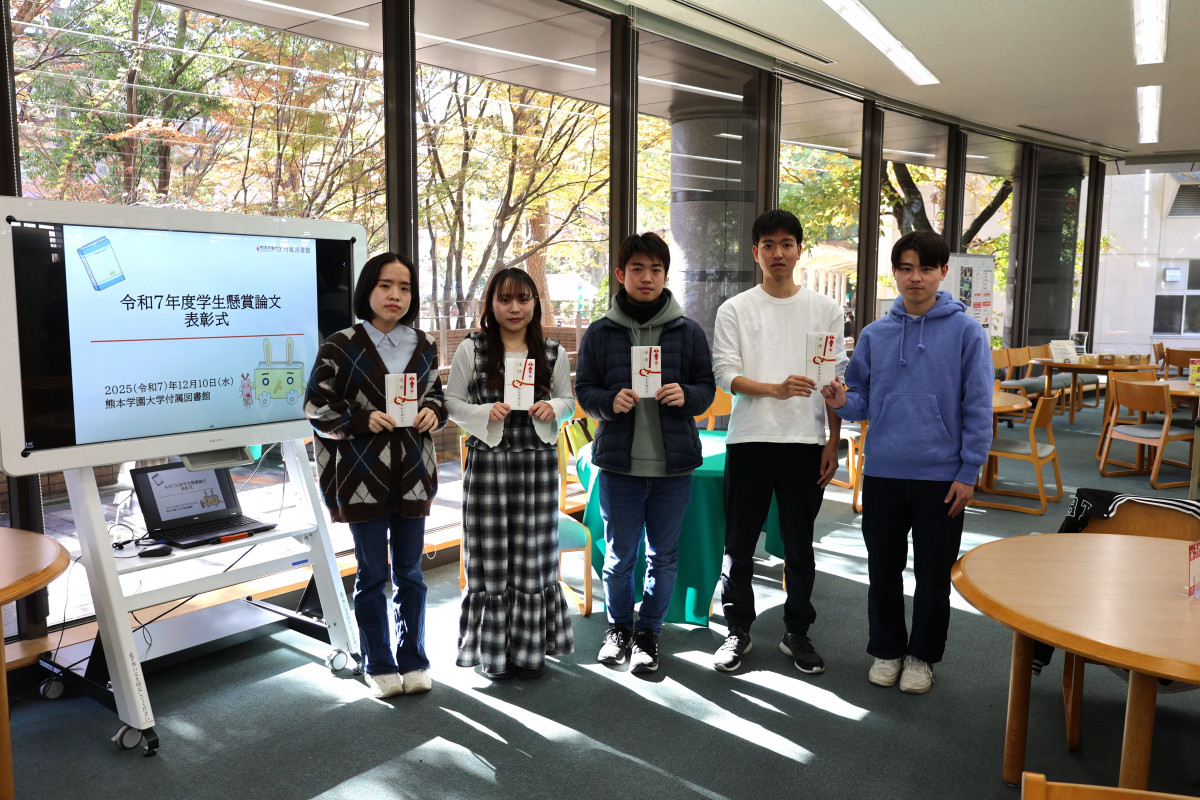 12月10日(水)、図書館ラーニングコモンズで、令和7年度学生懸賞論文表彰式が行われました。今年度は5篇の応募があり、論文としての体裁を重視した一次審査、内容に踏み込んだ専門委員による二次審査と、厳しい審査を経て、4篇が佳作に選ばれました。当日は圡井浩嗣図書館長より懸賞金が授与され、受賞学生のゼミや授業を担当する教員も出席し、学生たちの晴れやかな姿を温かく見守りました。