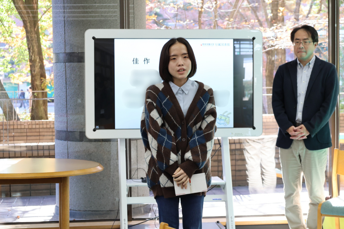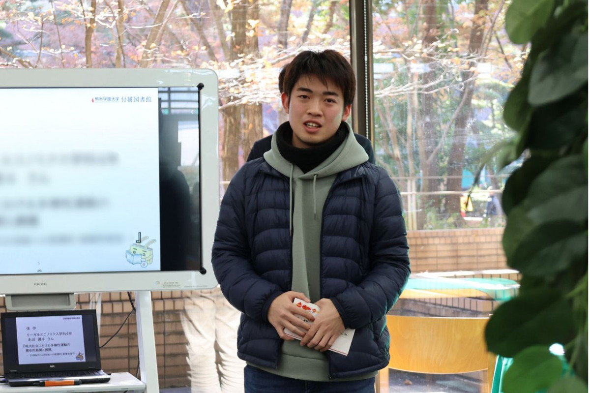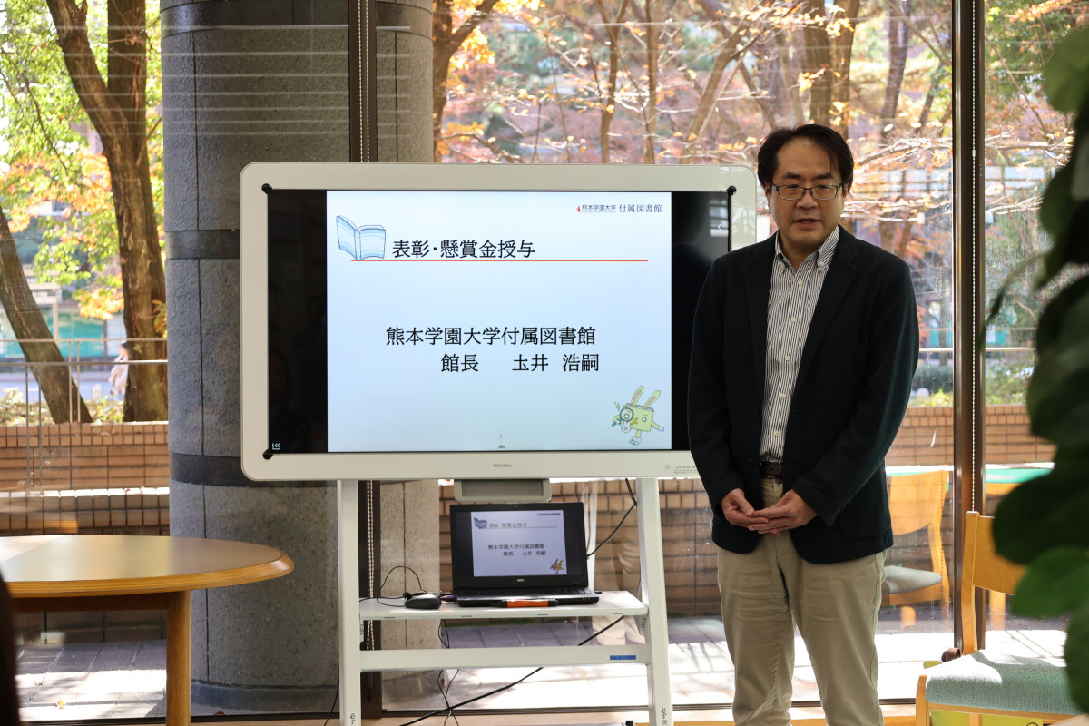 圡井浩嗣図書館長は、「それぞれの学生の皆さんが自ら資料を集め、調査し、考察や分析を重ねて独自の知見として論文をまとめあげた点に努力を感じました。また、その背景には指導教員の熱意あるご指導が反映されていると思います。自ら調べ、考え、新しい知見を見いだすことは大学教育の最終的な到達目標であり、今回の佳作4点はその成果だと思います。4年生は今回の論文をさらにブラッシュアップし、3年生はより高度な論文作成に挑んでください。社会に出れば答えのない課題に向き合うことになりますが、今回の取り組みは必ず役立つ経験となるので、これを糧に今後も学びを続けてほしいと思います」と挨拶しました。