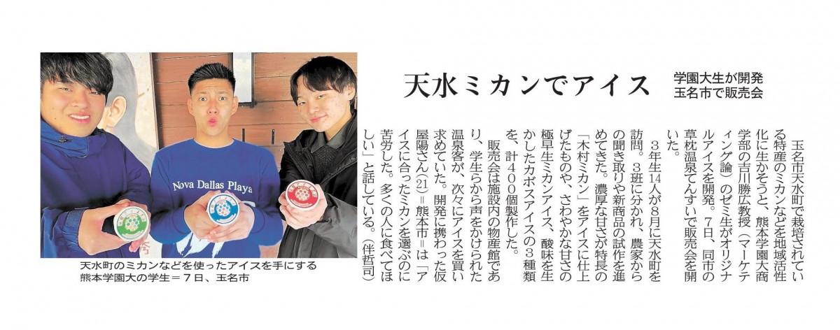 本学商学部の学生が、地域特産の天水みかんを使ったオリジナルアイスを開発し、玉名市草枕温泉てんすいで販売会を行った様子が掲載されました。