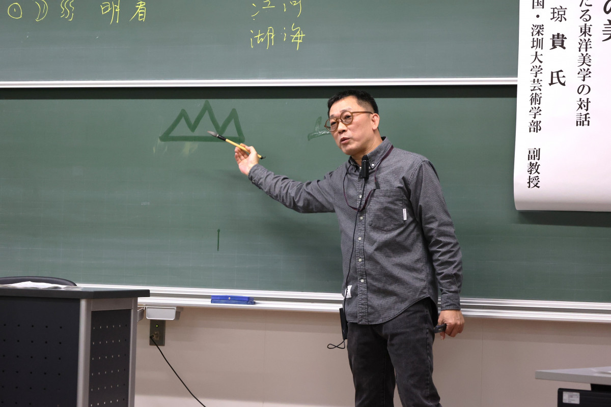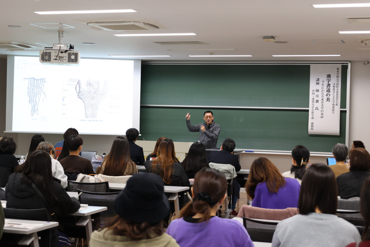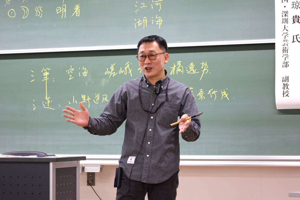 12月17日(水)、「新1号館 みらい」の132教室で、国際交流委員会主催の交換教員による学術講演会が開催され、学生、教職員、一般の43名が聴講しました。中国深圳大学からの交換教員陳琼貴(チンケイキ)氏が講師として「漢字書道の美 千年にわたる東洋美学の対話」と題し登壇しました。