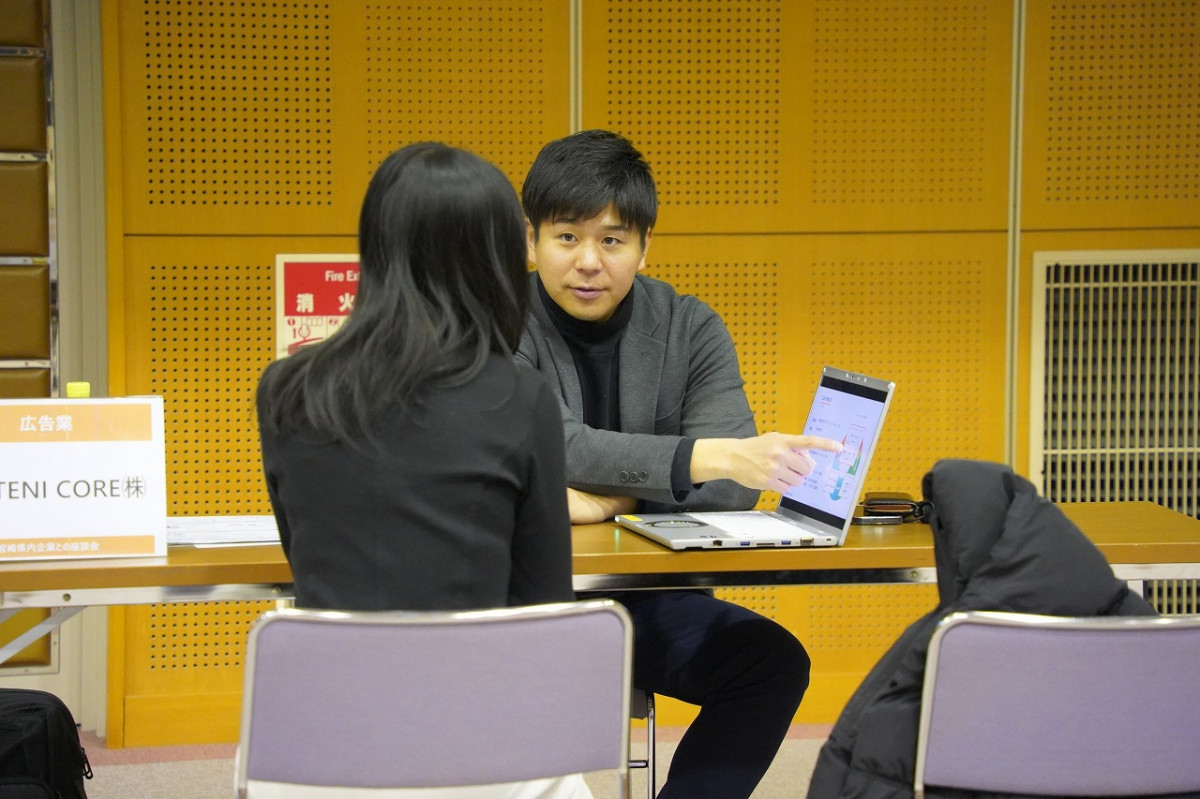 1月15日(木)、学生会館4階ホールで、宮崎県内の企業および官公庁を招いた「座談会」を開催しました。これは、令和2年に本学と宮崎県が締結したUIJターン就職支援に関する協定に基づき、出身地への就職(Uターン)や新天地での就職(I・Jターン)を希望する学生を支援する取り組みの一環として実施したものです。