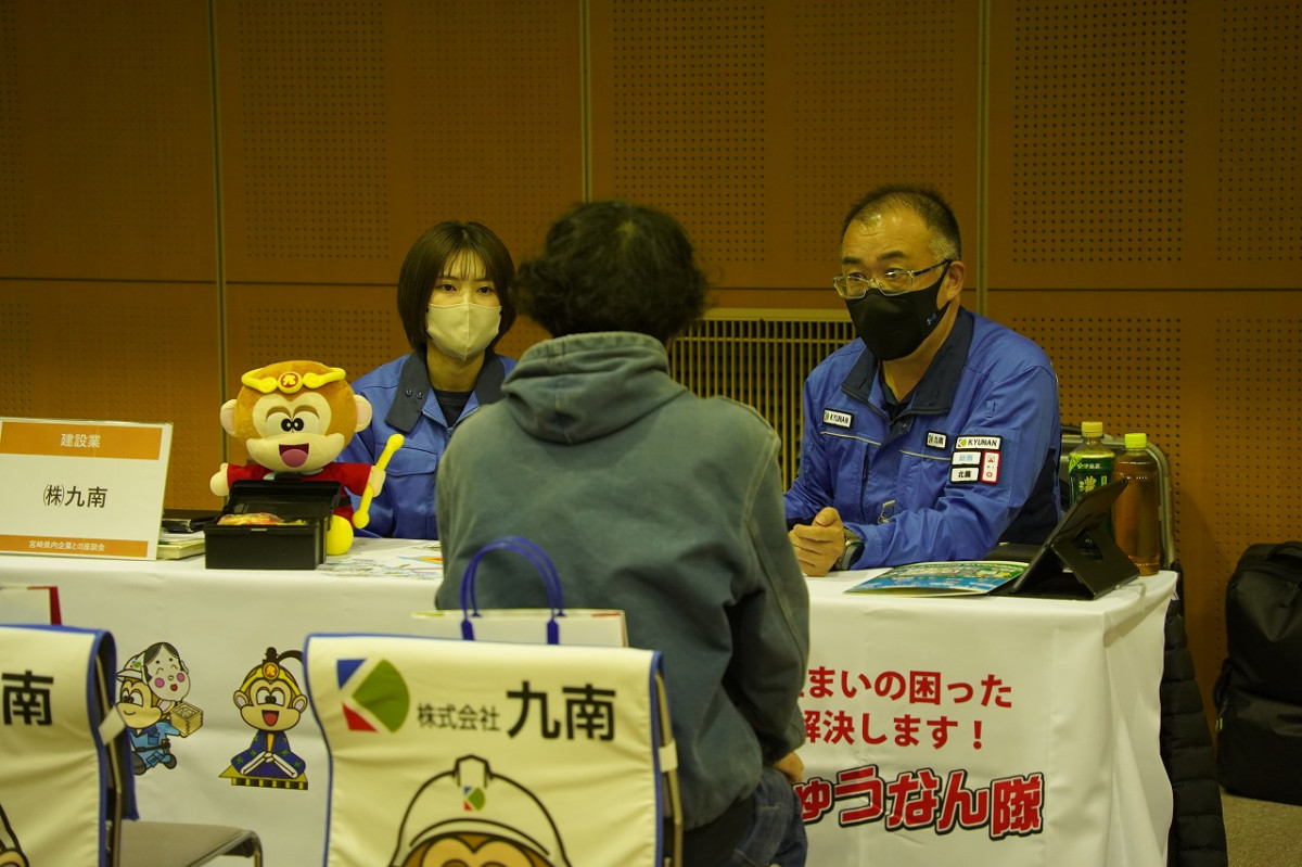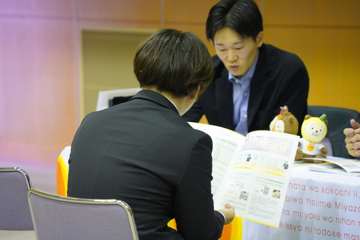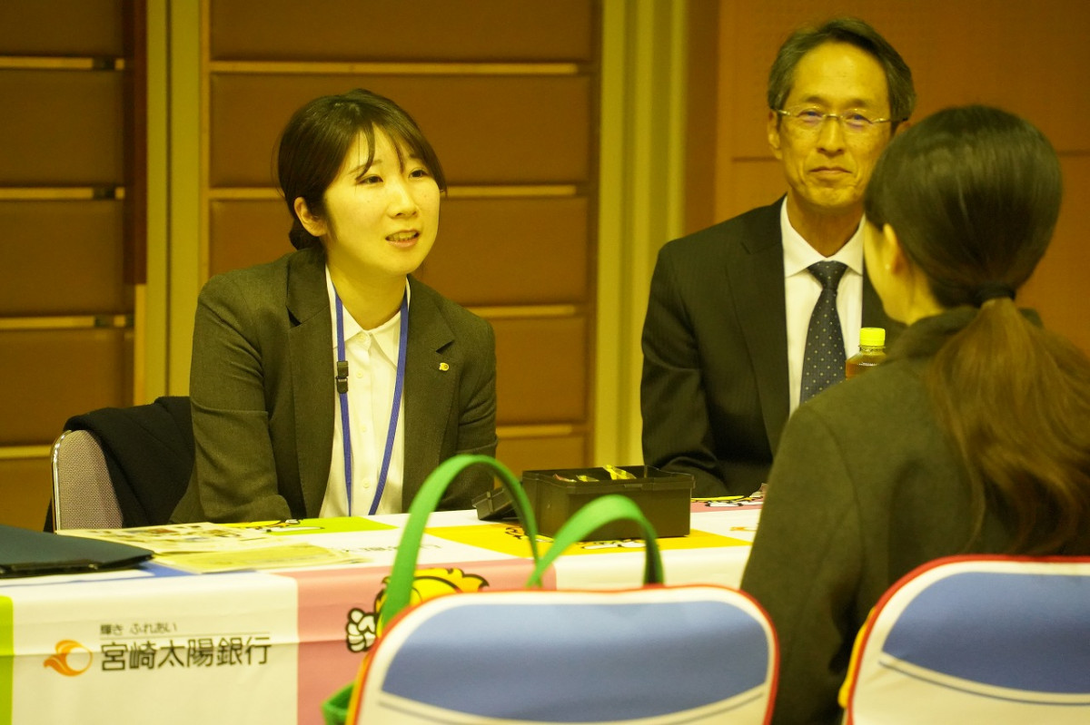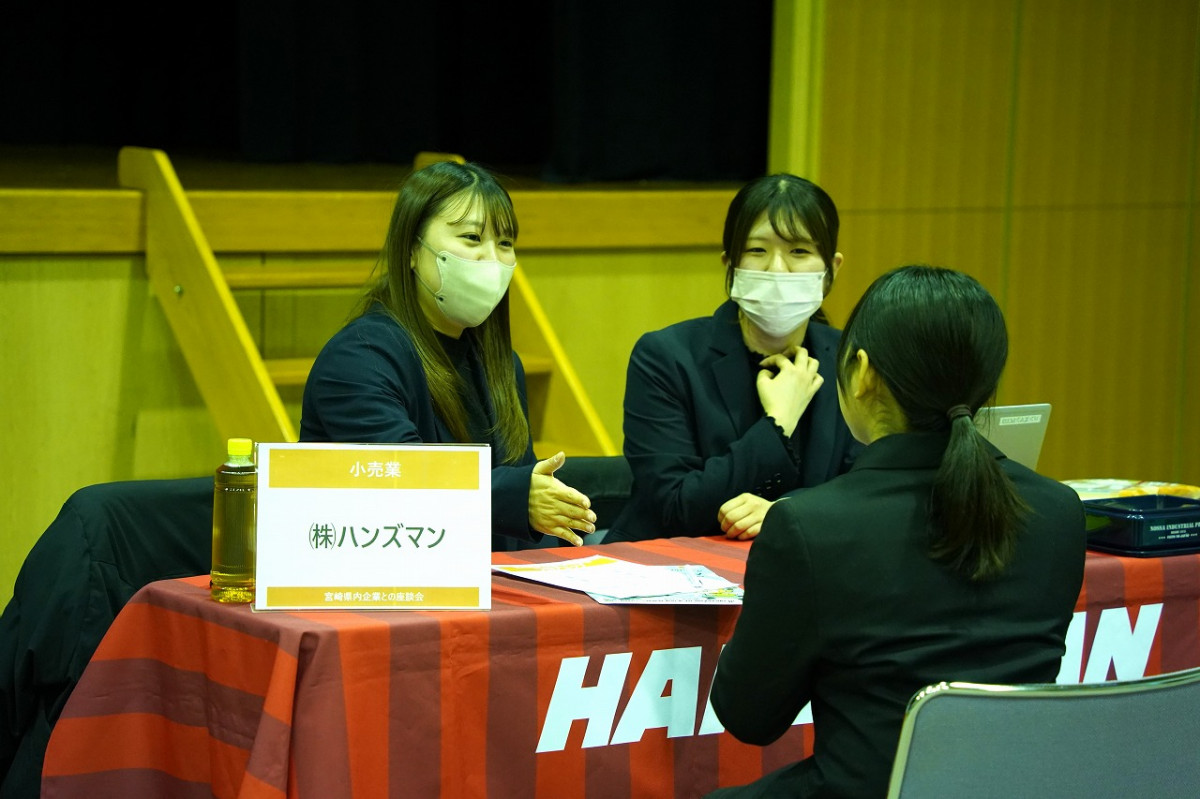 当日は、宮崎県商工観光労働部雇用労働政策課雇用対策担当主任主事の貴嶋智寛氏より、宮崎県内企業への就職活動やインターンシップ等に参加する際の各種補助金制度の概要、就職活動に関する情報提供が行われました。続く座談会には、宮崎県を代表する金融機関や建設業、小売業、官公庁など7団体が参加。各団体の担当者が、採用情報に加え仕事内容の実情や職場の雰囲気、働き方などについて、学生からの率直な質問に丁寧に応じました。