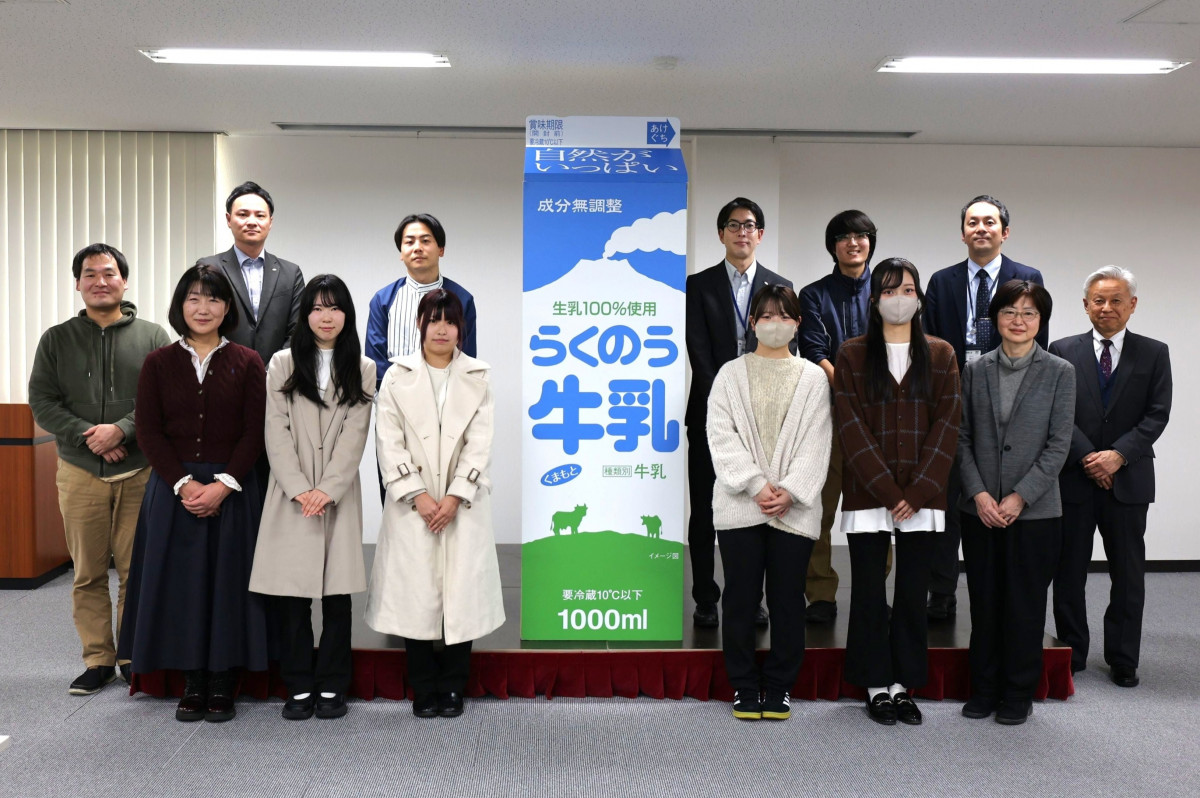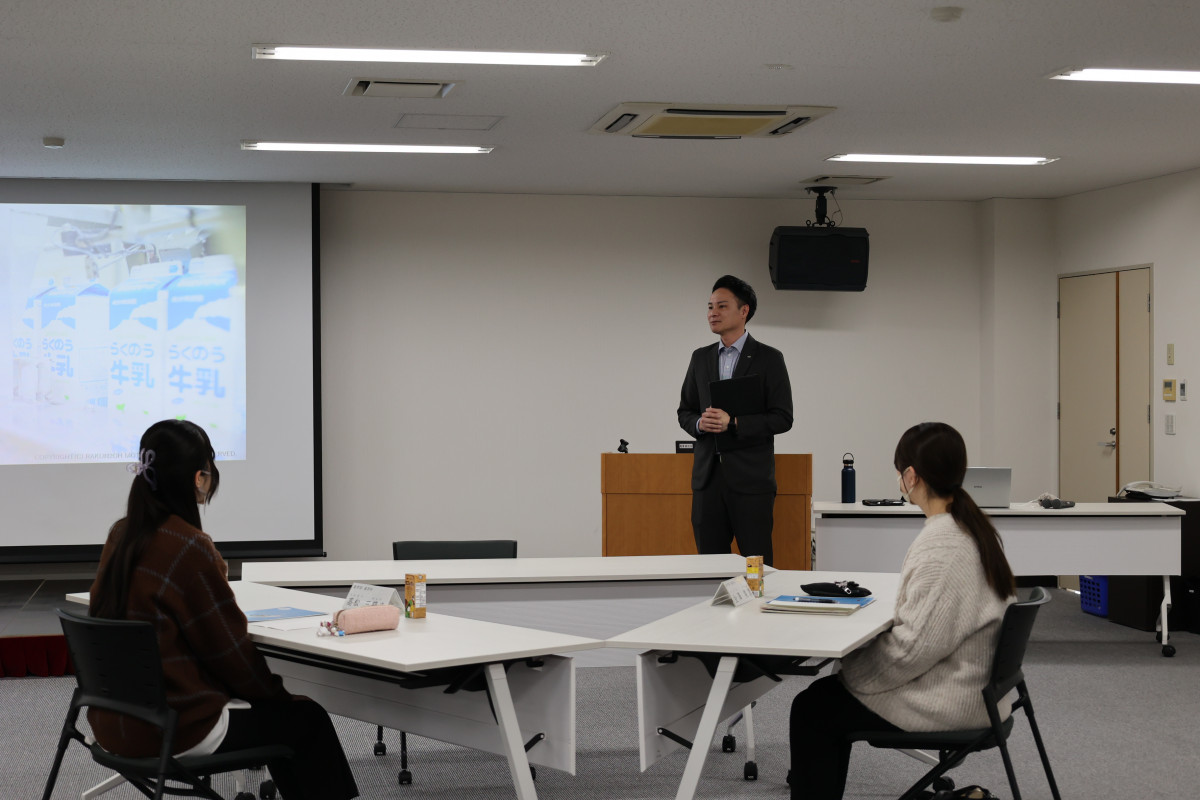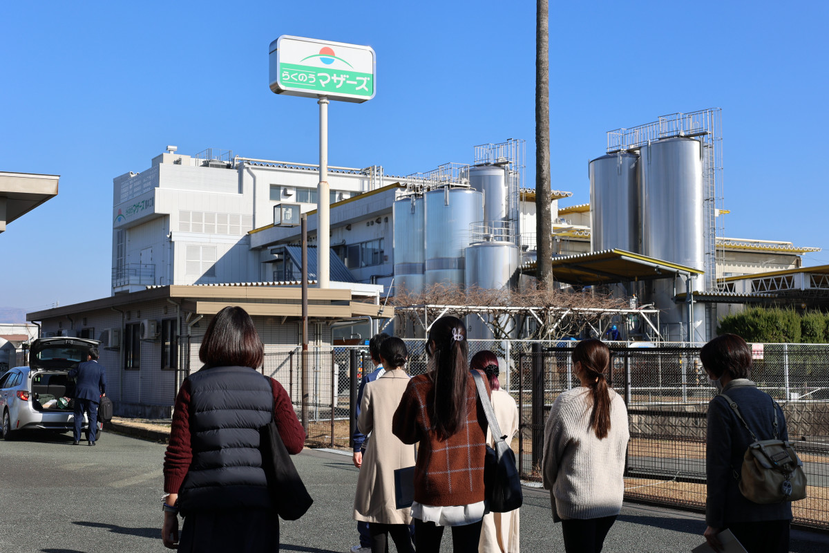 1月16日(金)、本学就職課が企画する「大学生の社会科見学」で、らくのうマザーズ(熊本県酪農業協同組合連合会)の熊本工場を訪問・見学しました。本企画は、学生が普段なかなか見ることのできない職場を実際に見学し、仕事のやりがいや魅力を発見することを目的とした取り組みで、ほかにも、計7社の企業訪問を予定しています。参加は希望制で、今回は2年生4名と本学教職員5名の計9名が参加しました。らくのうマザーズは、全国第3位の生乳生産量を誇る熊本県の酪農を支える総合酪農組織で、酪農家への支援から乳製品の製造・販売までをトータルに担い、地域に根ざして熊本の酪農と食を支えています。