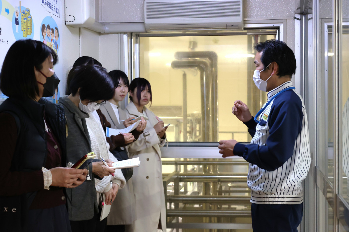 その後、生乳が工場に集荷される工程から、製造ラインでのパッケージへの印字や重量チェックの様子、さらにデザート工場までを見学しました。普段口にしている製品が、厳格な品質管理のもとで製造されている様子を間近で見ることで、学生たちはものづくりの現場への理解を深めました。
