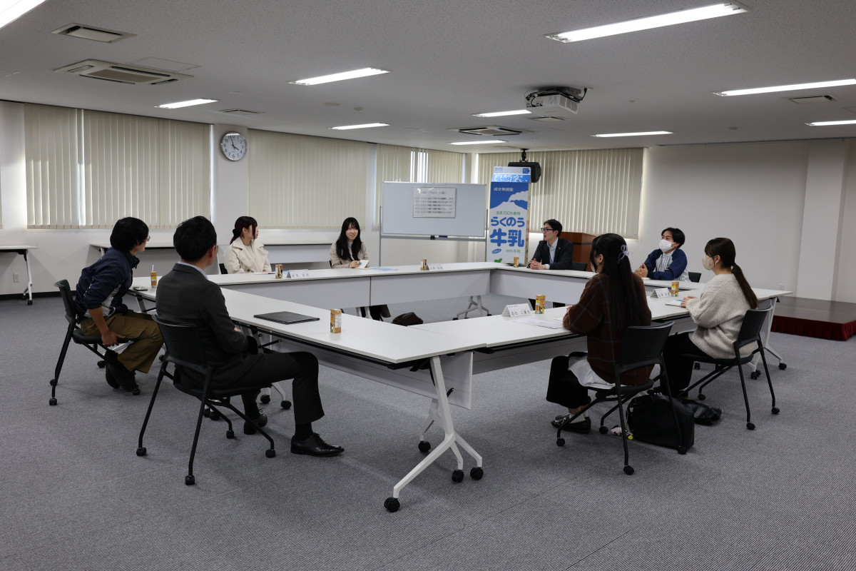 工場見学後には、らくのうマザーズで働く本学卒業生との座談会が行われました。就職活動の進め方や学生時代に取り組んだこと、現在の仕事のやりがいや魅力といった就職に関する話題に加え、学生時代にやっておいた方がよいこと、サークル活動や学生生活についてなど、幅広いテーマでざっくばらんな意見が交わされました。参加した学生からも積極的に質問が寄せられ、終始和やかな雰囲気のなかで、交流が深まりました。