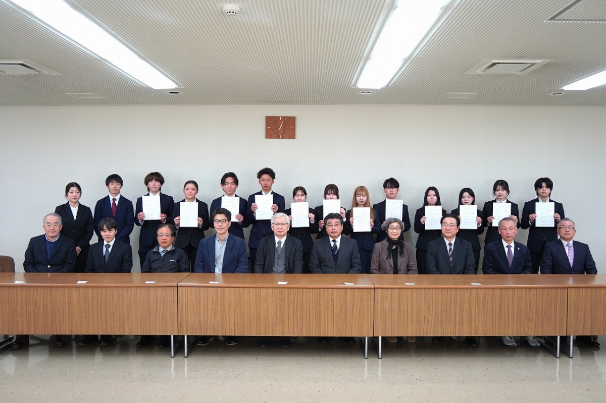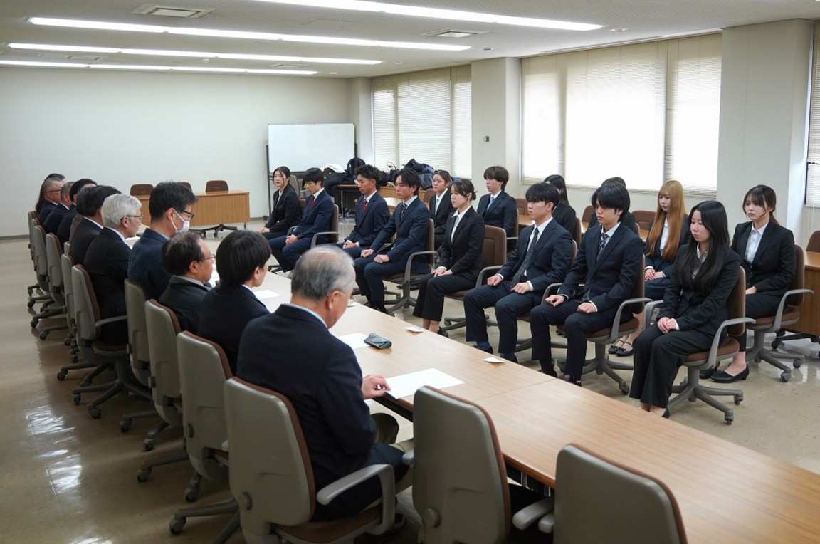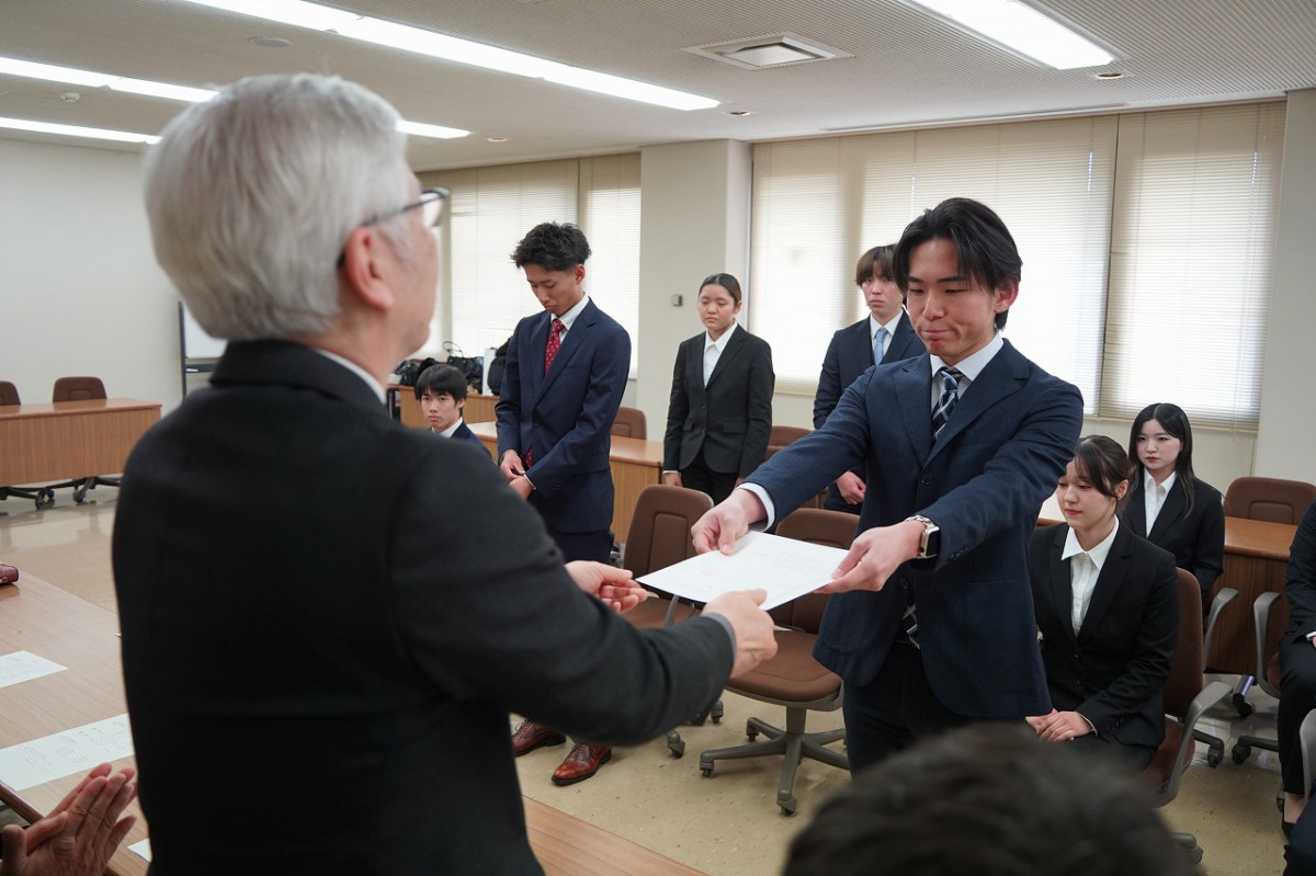 1月22日(木)、本館4階第二会議室において、「令和8年度交換留学留学許可書交付式」、「令和7年度短期認定留学留学許可書交付式」、「令和7年度アメリカショートプログラム結団式」が行われ、海外への派遣を予定している学生14名のほか、林裕学長をはじめとする学内関係者が出席しました。