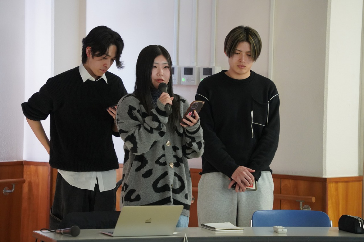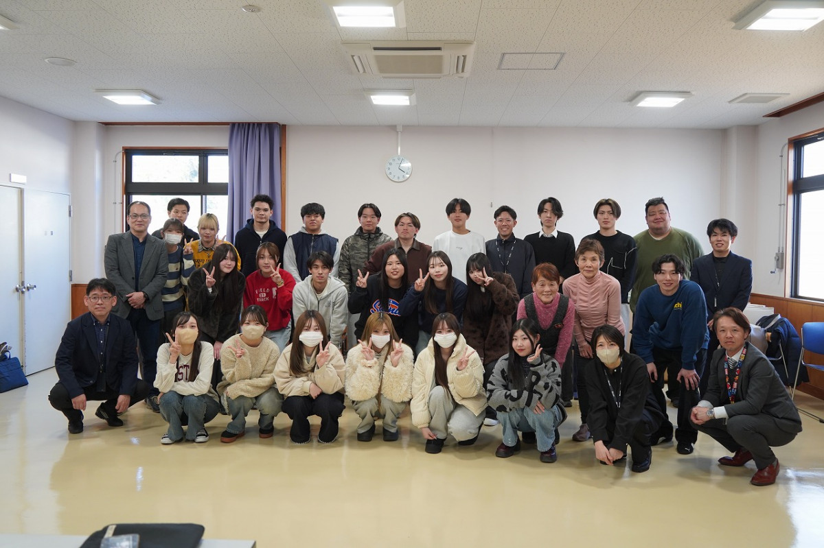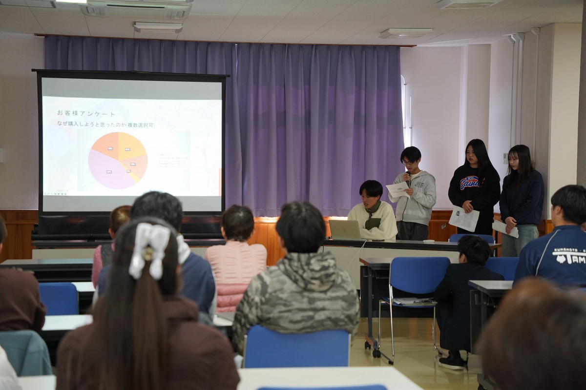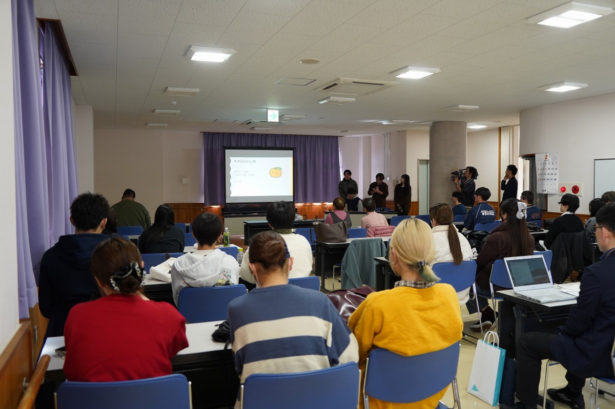 2月18日(水)、商学科の吉川勝広教授(専門:マーケティング論)の3年ゼミ生11名が、玉名市天水市民センター(玉名市天水町)で、3グループに分かれて取り組んだ、「天水みかんPRプロジェクト」の成果発表会を行いました。これは、玉名市天水町の活性化を目的に、2024年度から玉名市、天水地区地域おこし協力隊、地元事業者と連携して取り組んでいる産官学連携事業です。第2期目となる今年度は吉川ゼミ3年生に加え、青山学院大学中邨ゼミの学生4名も参画。特産品のみかんを活用した商品開発に加え、イベント企画やデジタル発信などPR活動へと展開し、首都圏での物産販売も視野に入れた広域的な取り組みへと発展しました。当日はゼミ2年生10名も参加し、地域の方々へ約1年間の成果を報告しました。