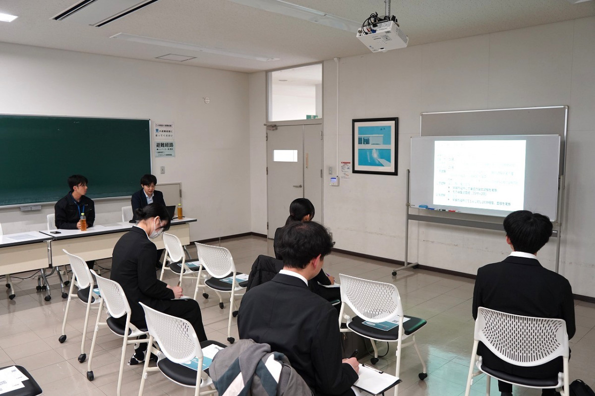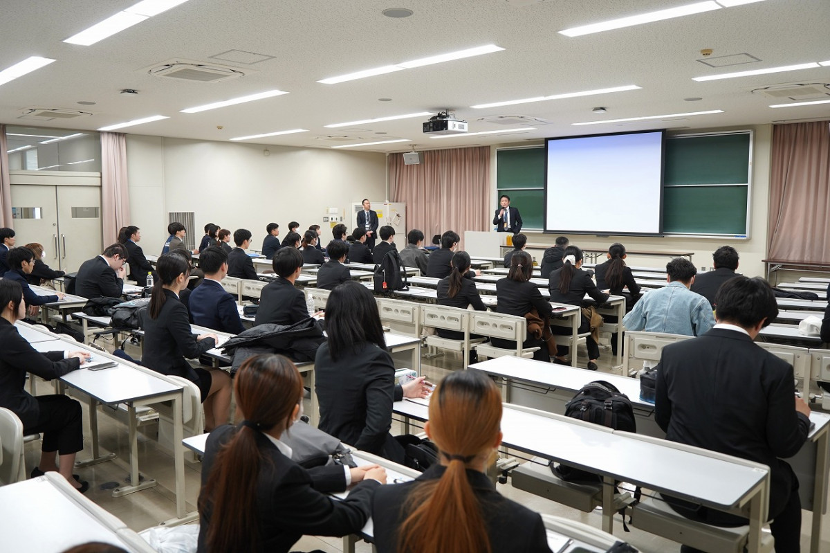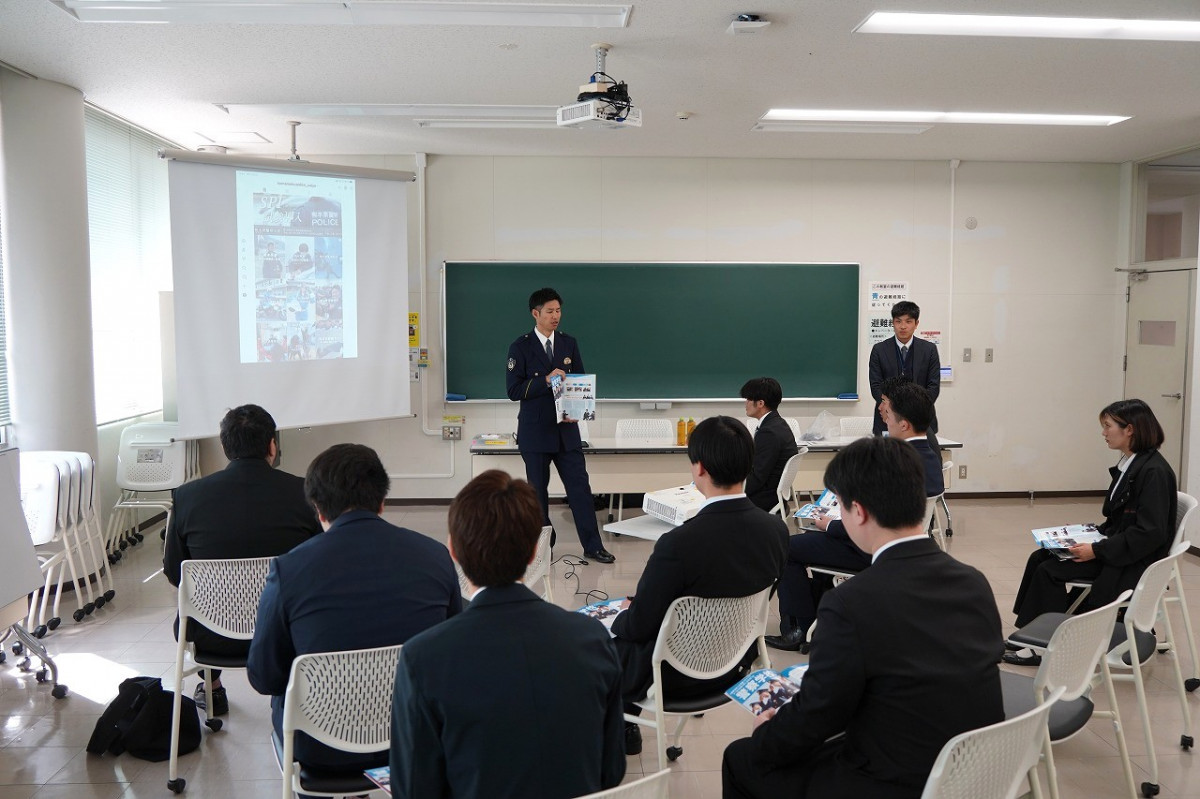 はじめに、就職課進行でオリエンテーションが行われ、各自治体から組織の概要について紹介が行われました。その後、自治体ごとに教室に分かれ、採用担当者が自治体の業務内容や特徴、採用試験の概要、仕事のやりがいなどについて説明。説明会は3回に分けて実施され、学生たちは複数の自治体の話を聞きながら、公務員として働く魅力や各自治体の役割について理解を深めました。