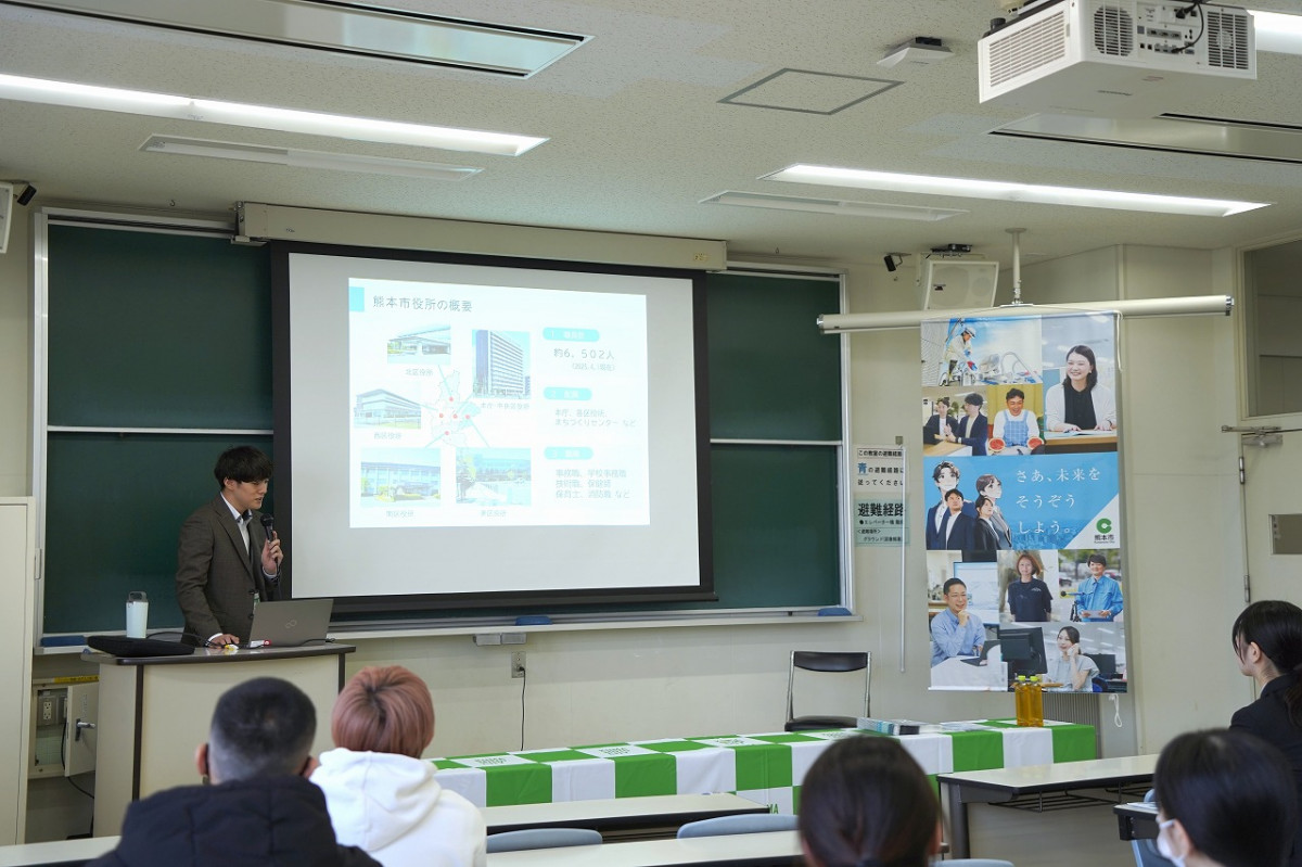 熊本市人事委員会事務局の野嶋俊輔主事は、市役所は住民に最も近い行政機関として、地域に密着した業務を担う点が特徴であると説明。また、「市民の方から『ありがとう』と言っていただけることや、自分の仕事が地域に反映されることにやりがいを感じている」と話しました。その後の質疑応答では、「熊本市をより良くするために必要なことは」との質問が寄せられ、同事務局任用班の酒井雄太郎主査が「市民のために、限られた予算のなかで効率的かつ改革志向を持って業務に取り組むことが重要」と回答しました。