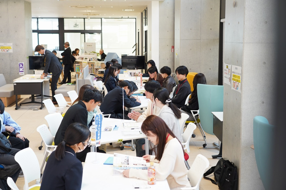 在学生による「個別相談ブース」には、多くの高校生や保護者が訪れ、実際の学生生活や授業内容について積極的に質問するなど、和やかな雰囲気のなかで交流が行われ、キャンパス見学では、西日本有数の規模を誇る図書館をはじめとする各施設を案内し、参加者は本学の充実した学習環境を実際に体感していました。