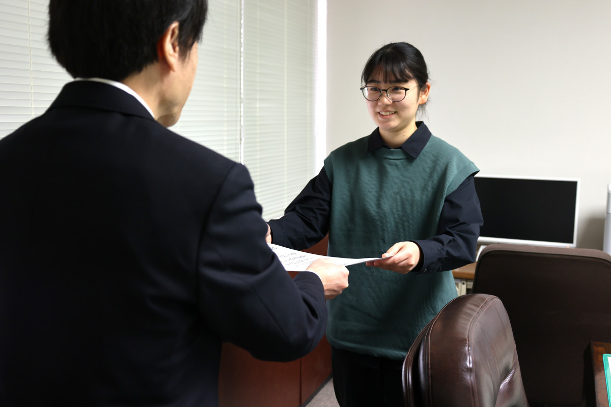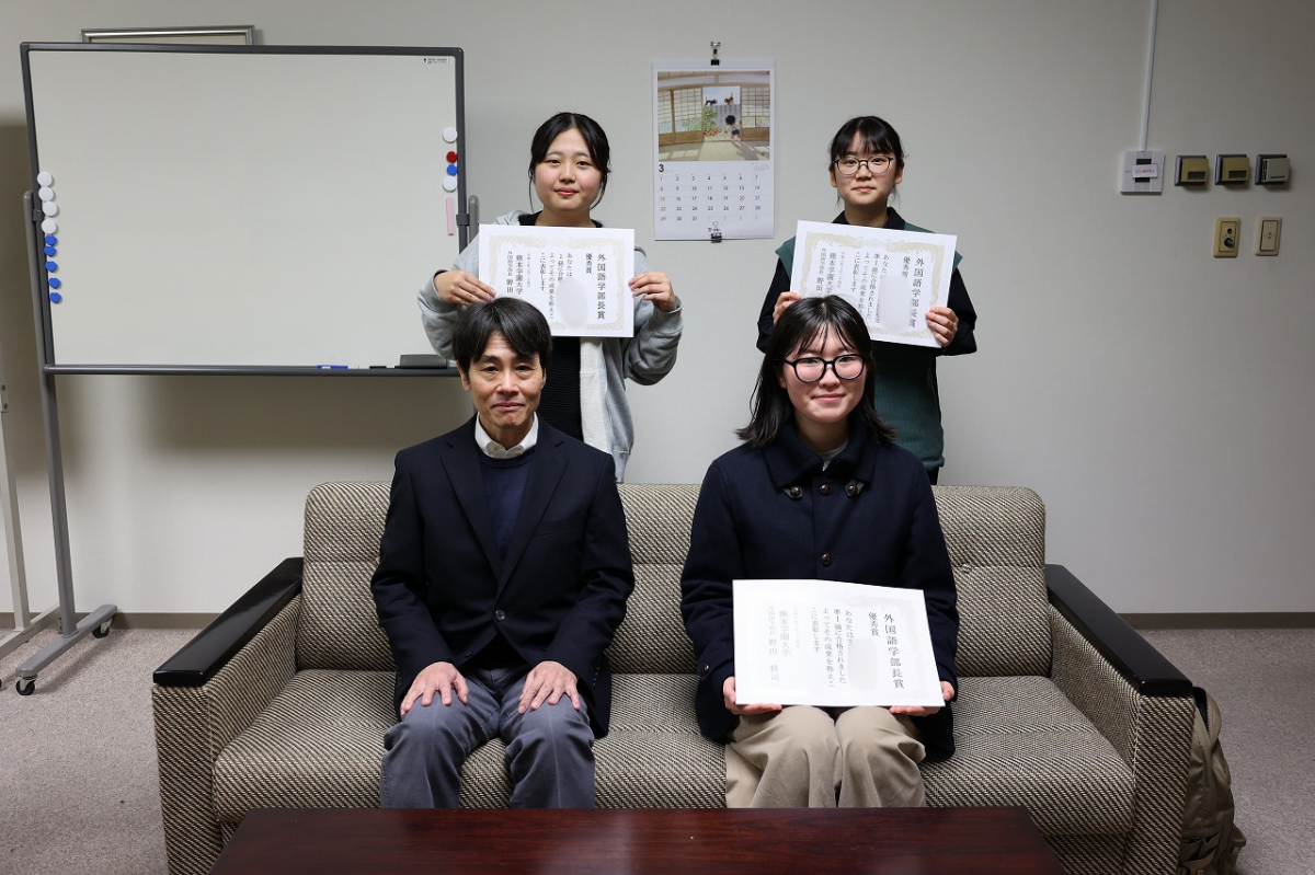 3月27日(金)、令和7年度外国語学部長賞表彰式が外国語学部長室で行われました。外国語学部長賞は、外国語学部が指定する語学検定試験を受験し、所定の成績・資格などを取得した学生を表彰することで、今後一層の研鑽に期待して設けられた制度で、4名が表彰されました。