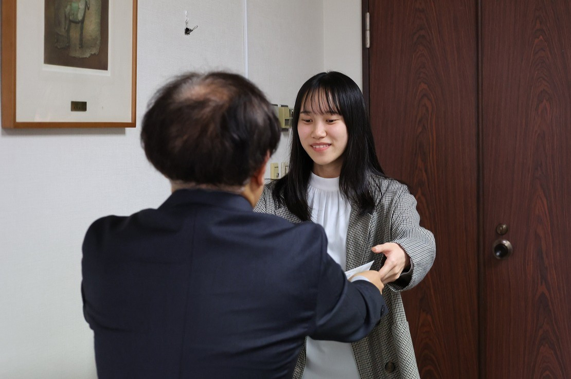 小葉武経済学部長は、受賞者一人ひとりに賞状を手渡し、祝福と激励の言葉を送りました。その後、受賞した学生たちと資格取得に向けた取り組みや学習方法、経済学部での学び、キャンパスライフなどについて懇談し、今後のさらなる成長に期待を寄せました。