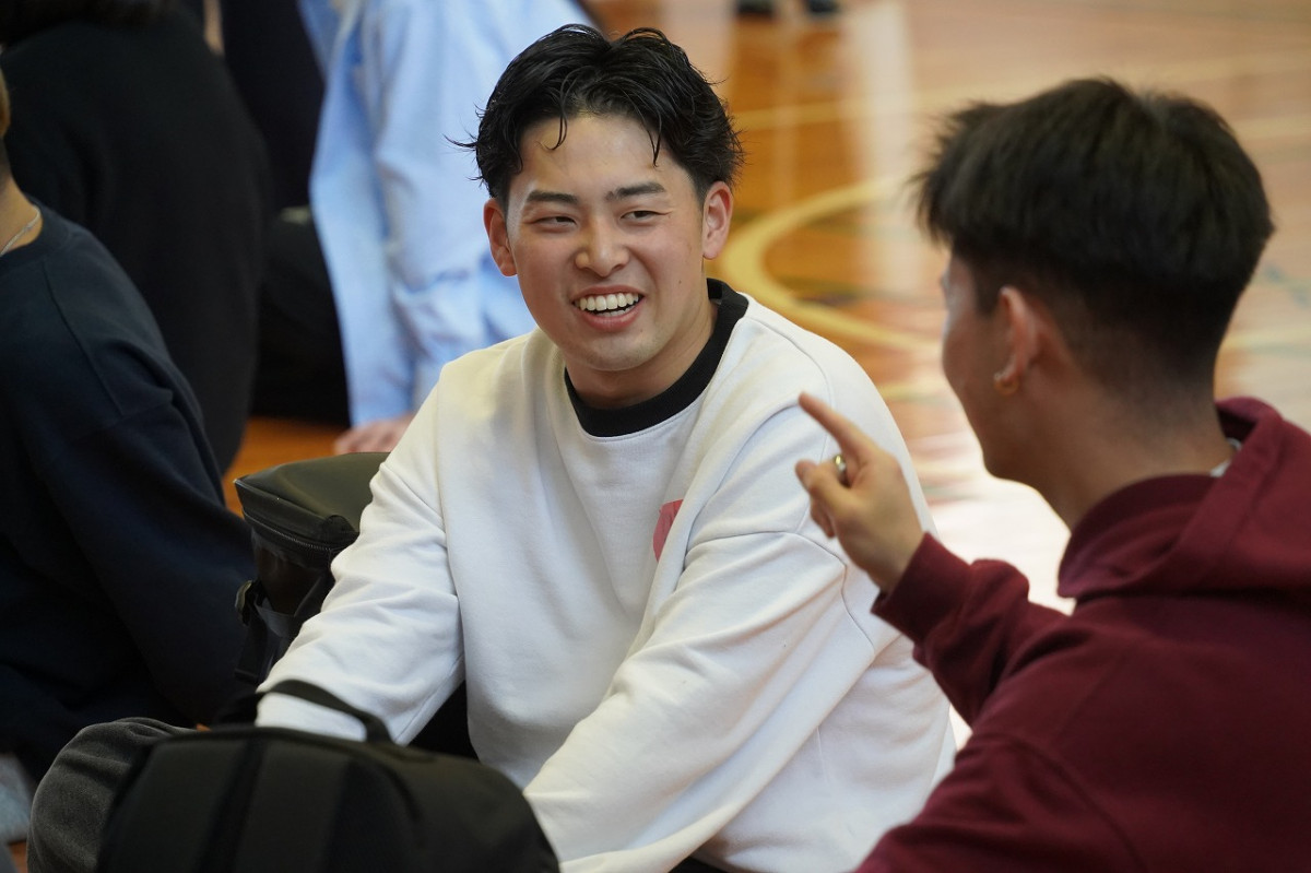 4月7日(火)、本学総合体育館2階で、学生自治会体育常任委員会が主催する「出身県別の集い(県人会)」が開催され、新入生97名と在学生ボランティア29名、新入交換留学生14の計140名が参加しました。この催しは、熊本県外や県内の遠方から本学に進学した新入生を中心に、学生同士の交流を目的として毎年実施されており、今年で13回目。参加者は福岡、佐賀、大分、長崎、宮崎、鹿児島、沖縄、愛知、熊本などの出身県ごとに分かれた全16チームに編成。また、留学生も各班に加わり、自己紹介を交わしながら積極的に交流を深める姿が見られました。