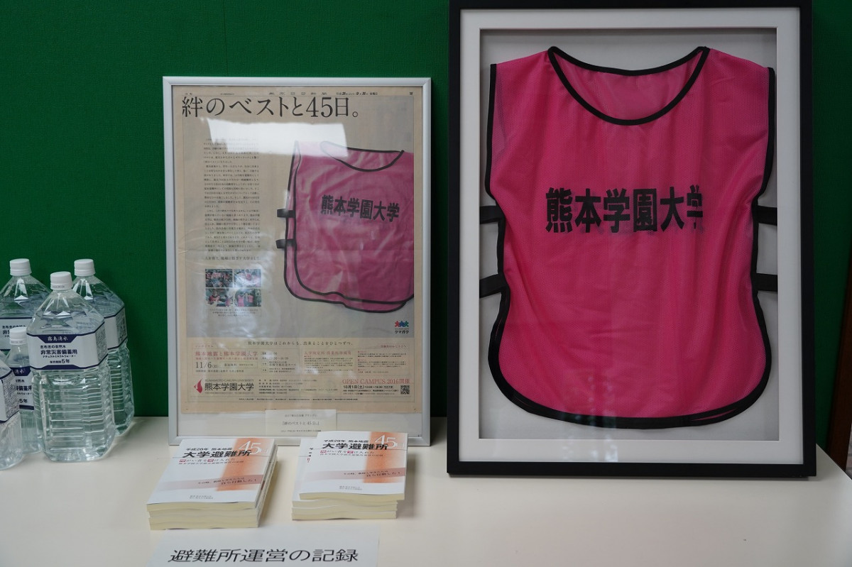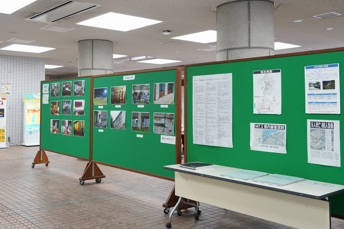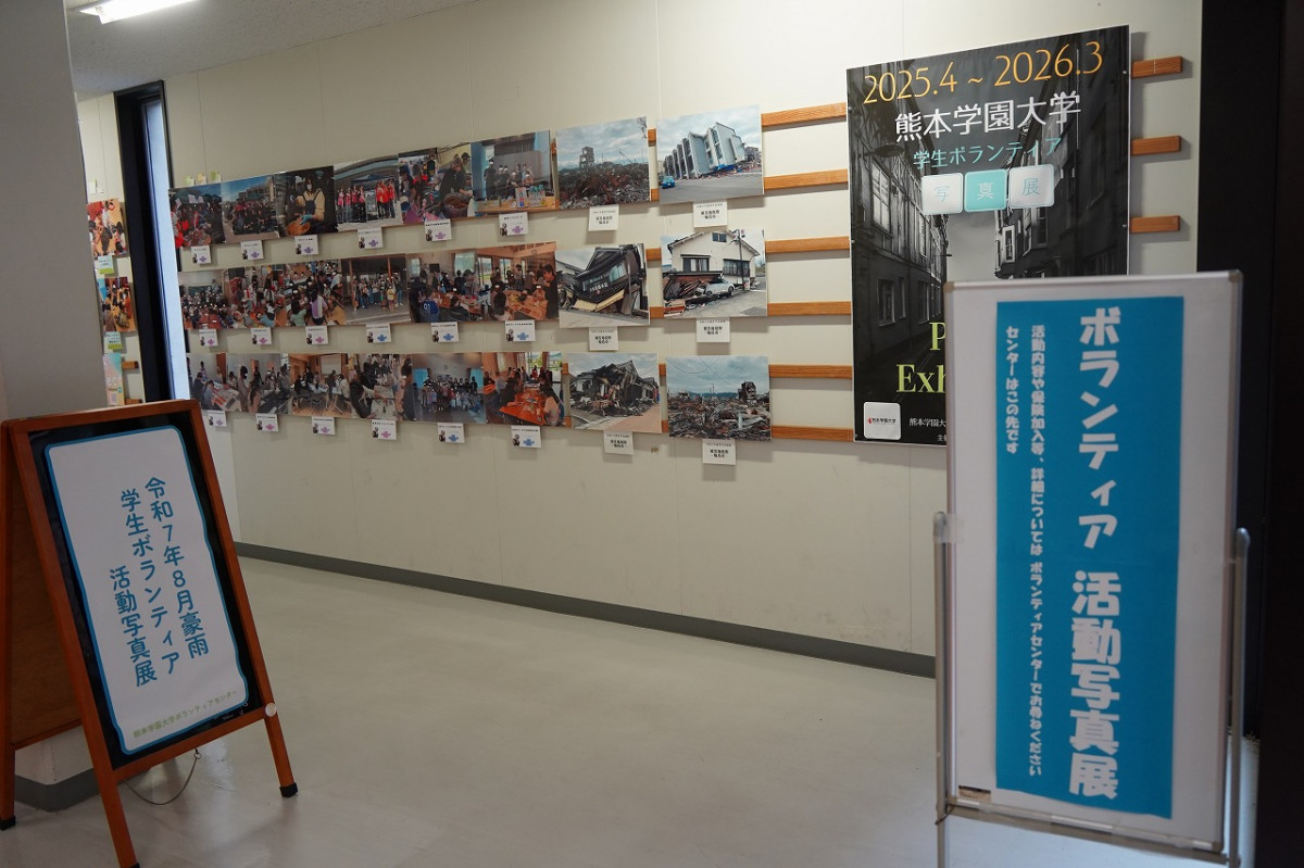 さらに14号館では、震災をきっかけに発足したボランティアセンターによる写真展を開催中です。発足当時から活動を続ける学生団体の歩みや、昨年の熊本豪雨をはじめとする近年の災害支援に汗する学生たちの姿を通じ、今もなお受け継がれる「互助」の精神を学内外へ発信しています。