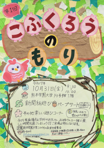 第1回「こふくろうのもり」では、新聞紙遊びやペープサートをはじめ、子どもたちが楽しめるさまざまな遊びコーナーを用意しています。子ども家庭福祉学科のお兄さん、お姉さんと一緒に、楽しい時間を過ごしましょう!