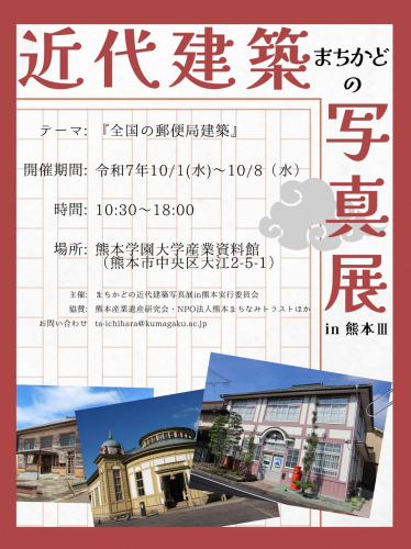 商学部市原ゼミが企画運営に携わる「まちかどの近代建築写真展in熊本Ⅲ」を開催します。日本全国に遺る郵便局建築の各種写真を熊本学園大学産業資料館という歴史的空間の「場の力」を利用して地域住民に広く紹介します。
