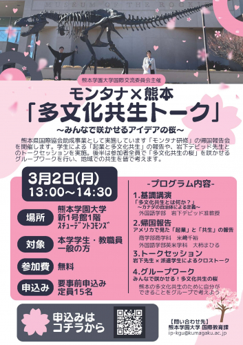 熊本県国際協会助成事業として実施している「モンタナ研修」の帰国報告会を開催します。 学生による「起業と多文化共生」の報告や、岩下デビッド先生とのトークセッションを実施。後半は参加者全員で「多文化共生の桜」を咲かせるグループワークを行い、地域での共生を皆で考えます。