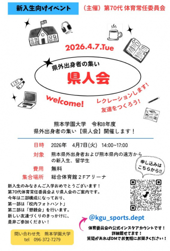 対 象:熊本県外出身の新入生、熊本県内の遠方からの新入生、新入留学生、在学生