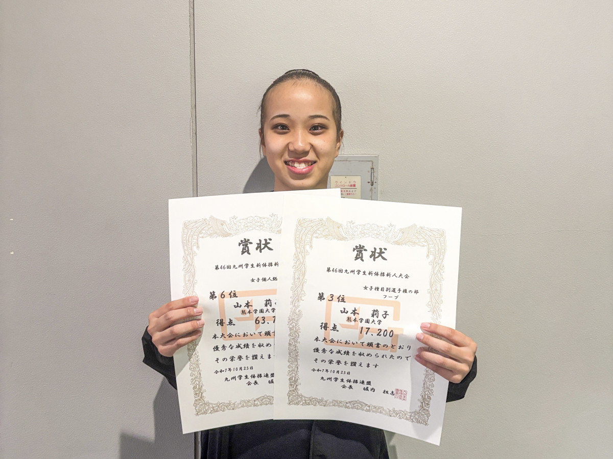 本学からは新体操部の瀬川 愛理(ライフ1年/千原台高校出身)と山本 莉子(子福1年/佐賀女子短期大学付属佐賀女子高等学校出身)が出場。瀬川は個人総合で優勝を果たし、さらに種目別でもフープ・ボール・クラブ・リボンの全4種目でいずれも第1位を獲得する快挙を達成しました。山本も個人総合6位入賞、種目別フープで第3位と健闘しました。
