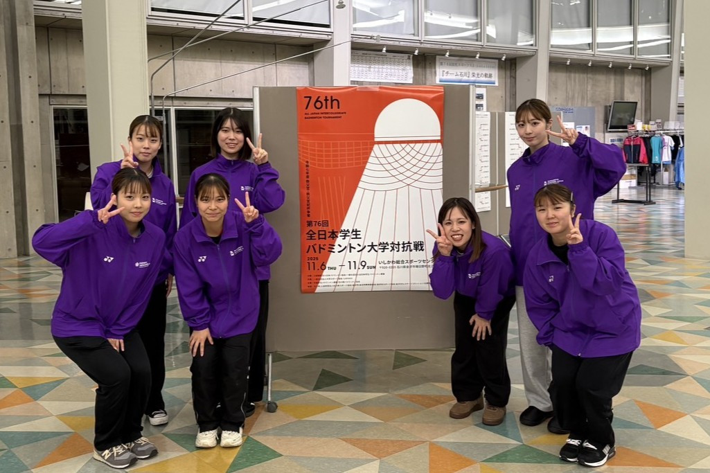 令和7年11月6日(木)~9日(日)に石川県・いしかわ総合スポーツセンターで開催された、大学日本一を決める大会「令和7年度 秩父宮・秩父宮妃杯争奪 第76回全日本学生バドミントン大学対抗戦」において、本学バドミントン部女子チームが九州ブロック代表として出場しました。