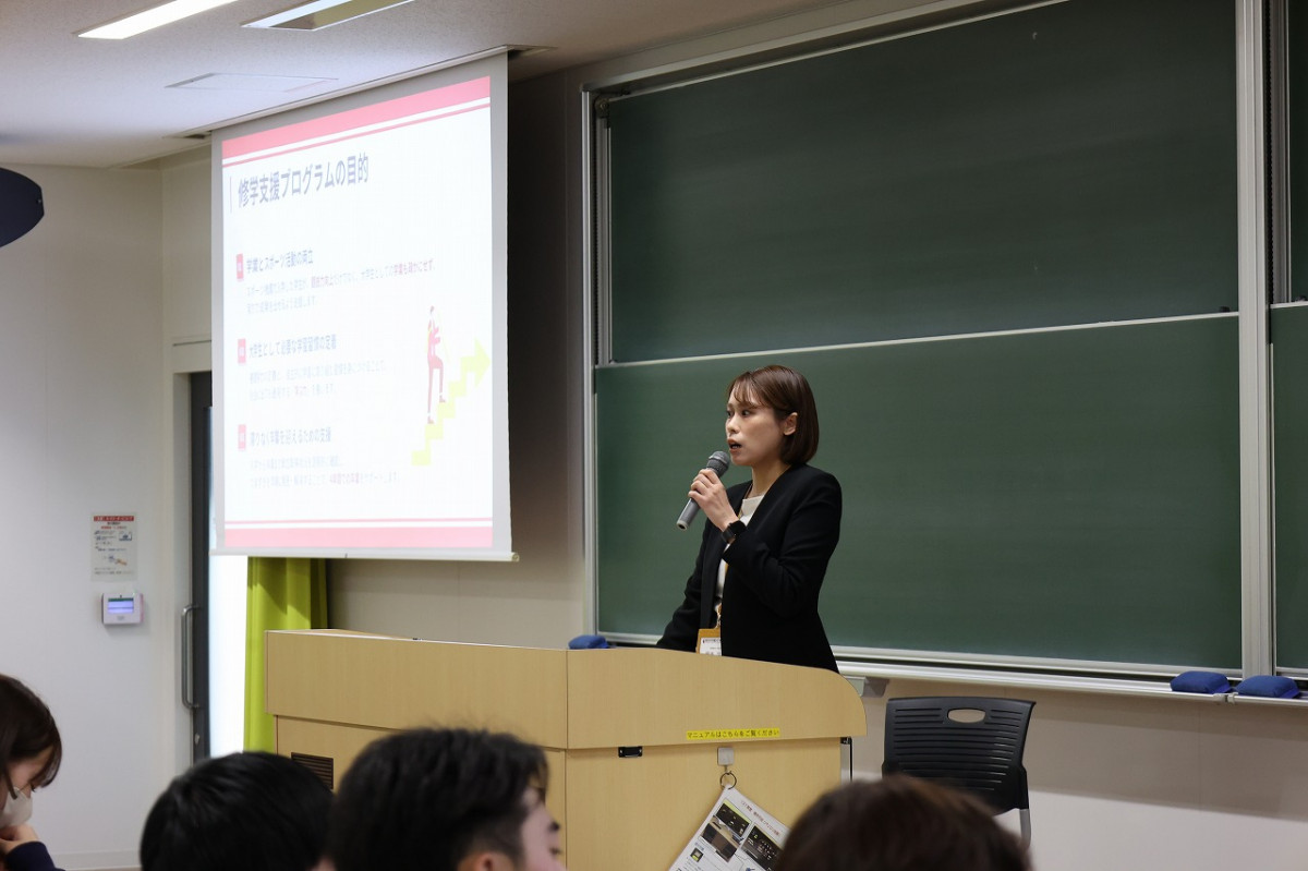 続いて、スポーツ振興センター事務室の岡本 沙織 氏より、スポーツ推薦入学者を対象とした修学支援プログラムについて解説。本プログラムは、競技と学業の両立を実現するため、学習習慣の定着や単位修得状況の確認、必要に応じた個別面談の実施などを通して、4年間にわたり継続的な支援を行うもの。岡本氏は、スポーツ推薦入学者を対象に展開される修学支援プログラムにおいて、「両立においては自己管理が重要である。日々の生活習慣を整え、主体的に学習に取り組んでほしい」と述べました。